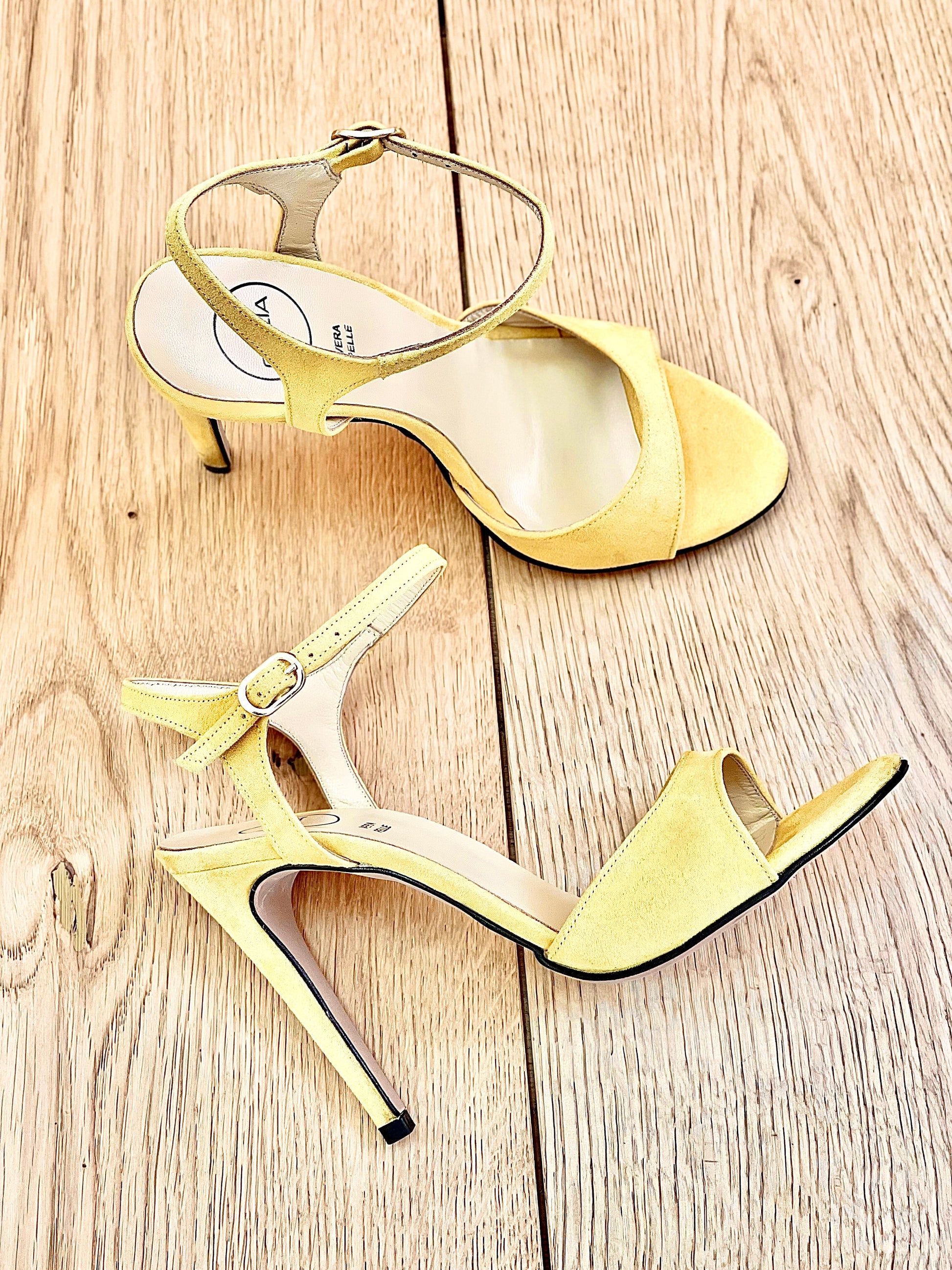 סנדלים מזמש עם עקב גבוה, רצועה ועקב סטילטו.