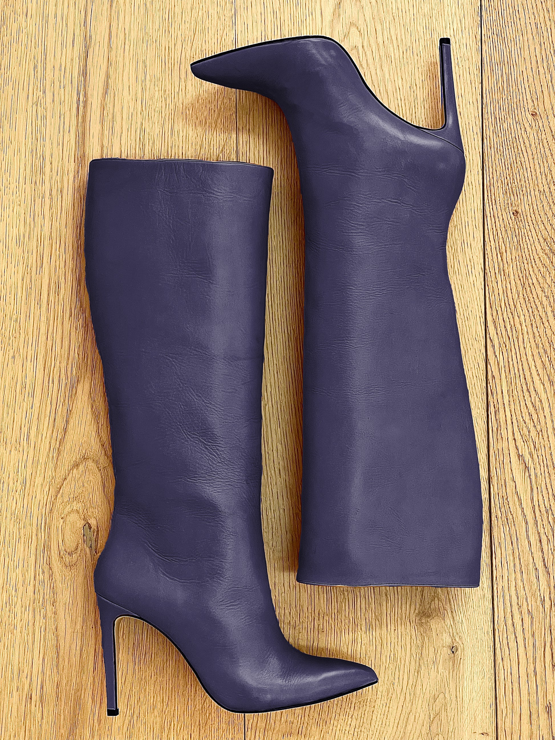 מגפיים צינוריים גבוהים עם חרטום מחודד ועקב סטילטו.