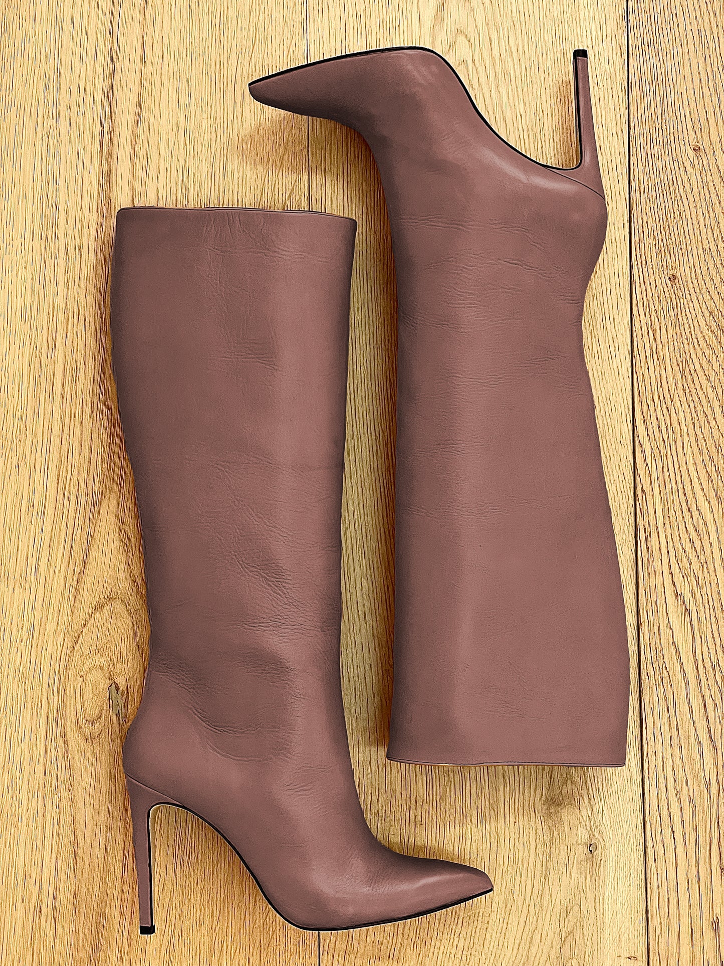 מגפיים צינוריים גבוהים עם חרטום מחודד ועקב סטילטו.