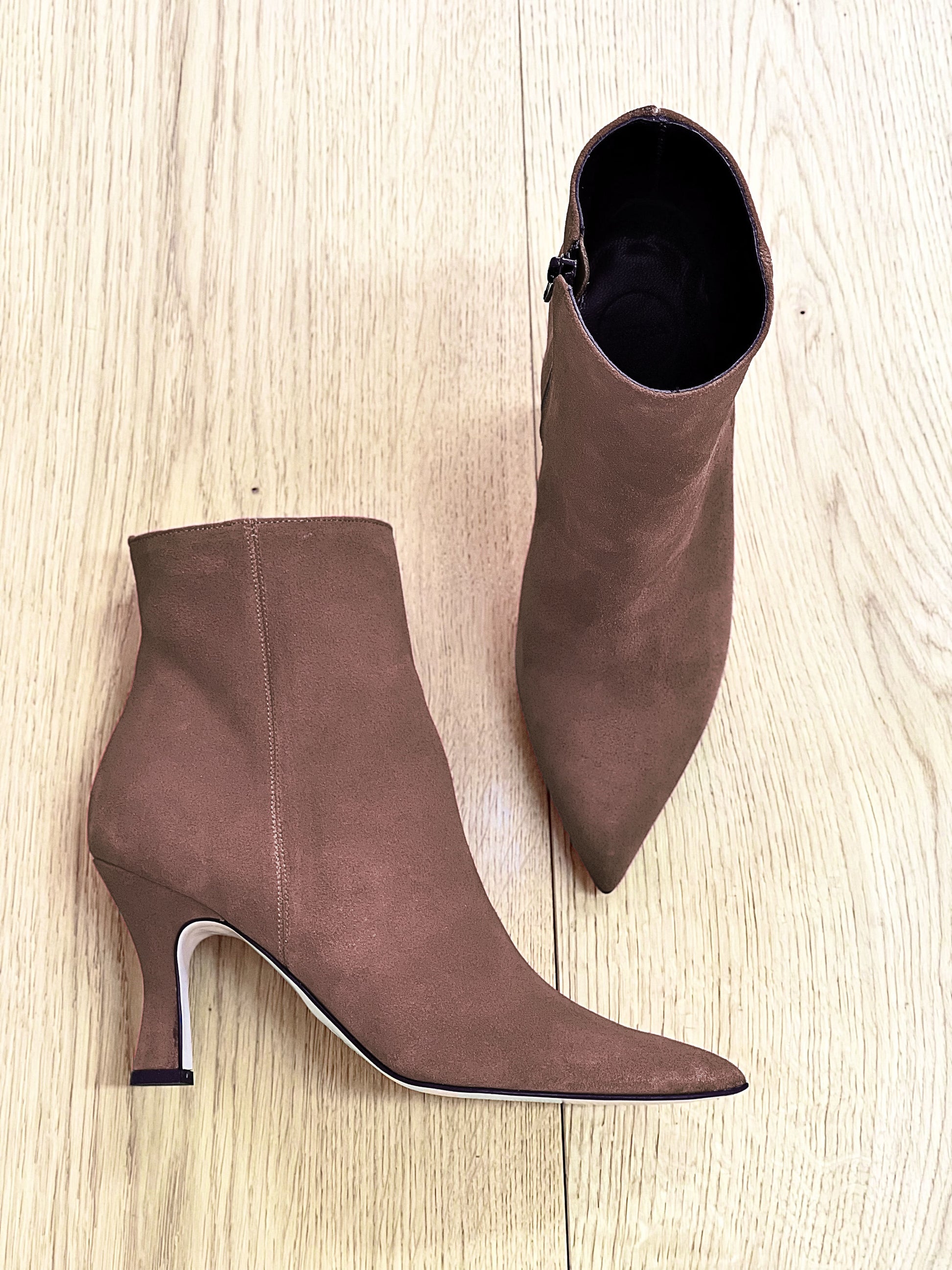 מגפוני קרסול מזמש עם חרטום מחודד ועקב בגובה 8 ס"מ.