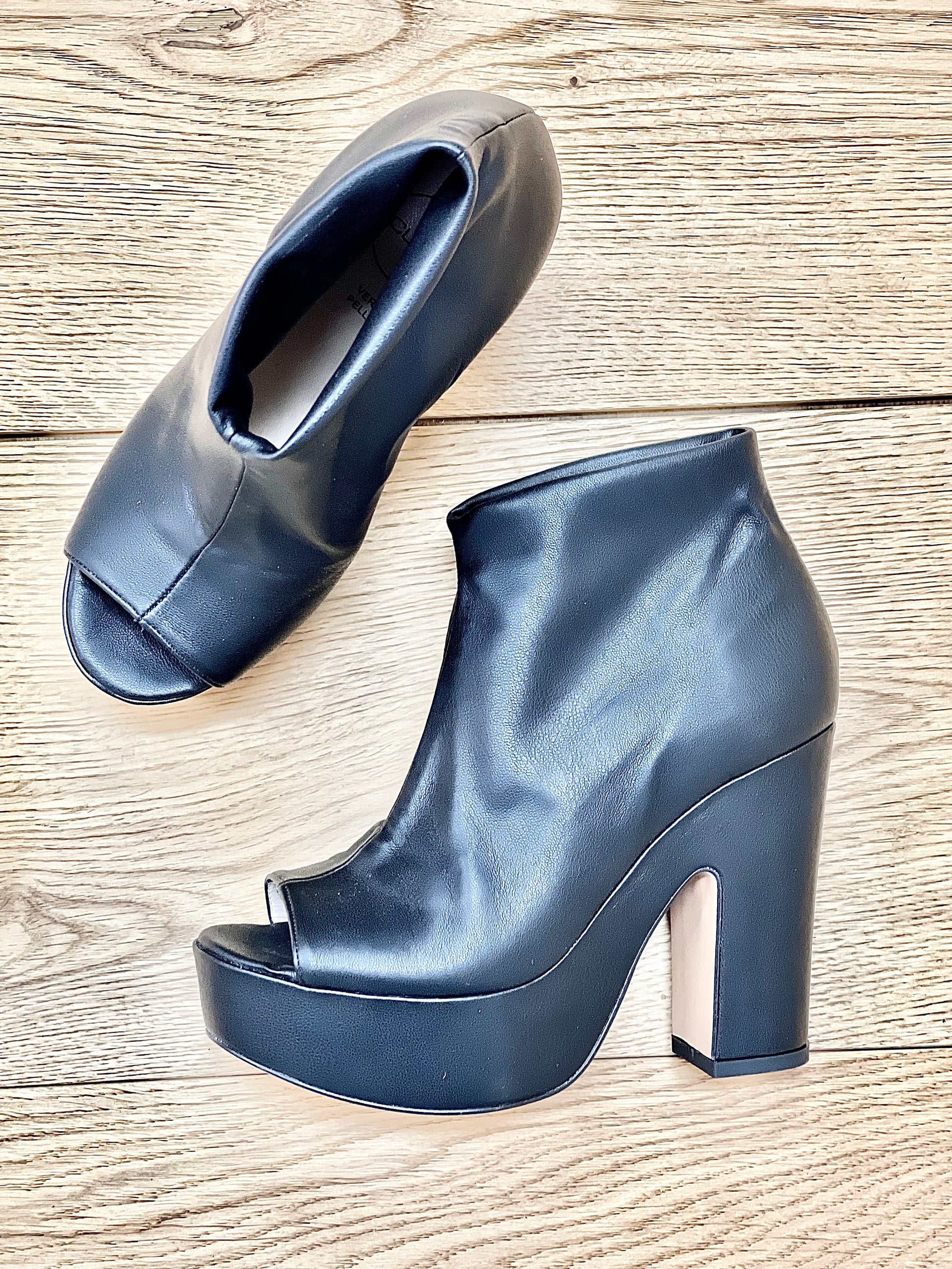מגפוני קרסול פתוחים מעור נמתח, עם פלטפורמה בגובה 11 ס"מ ופלטפורמה בגובה 4 ס"מ.