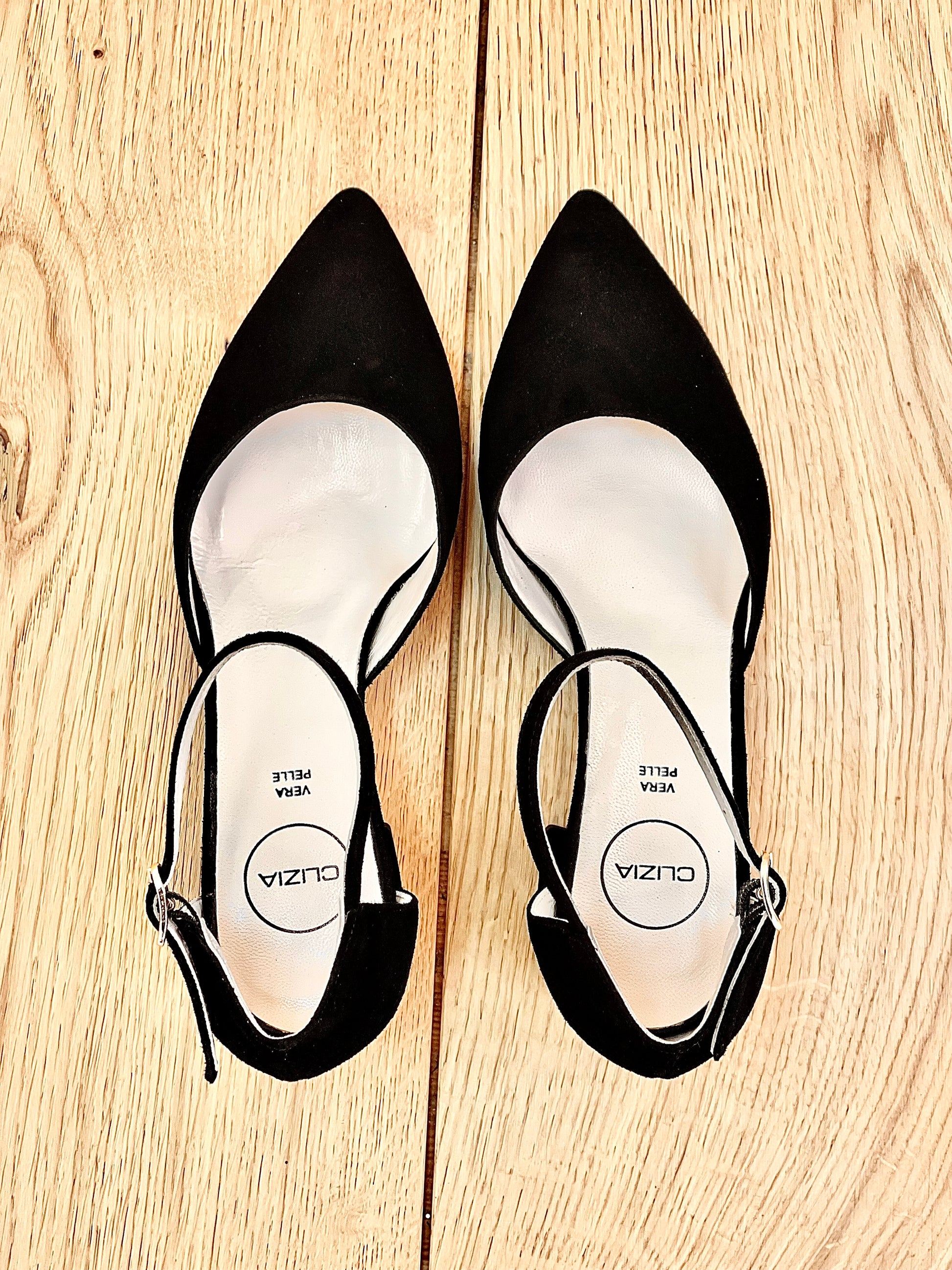 נעלי עקב מחודדות מזמש עם עקב רחב.