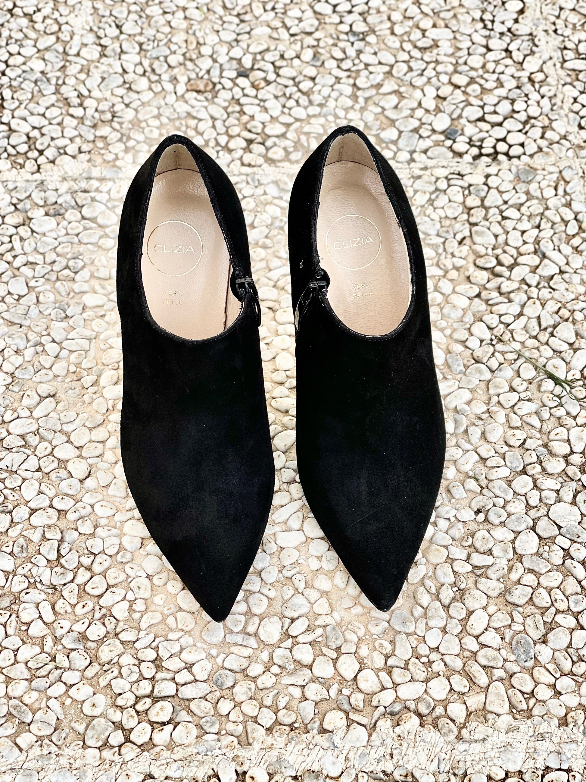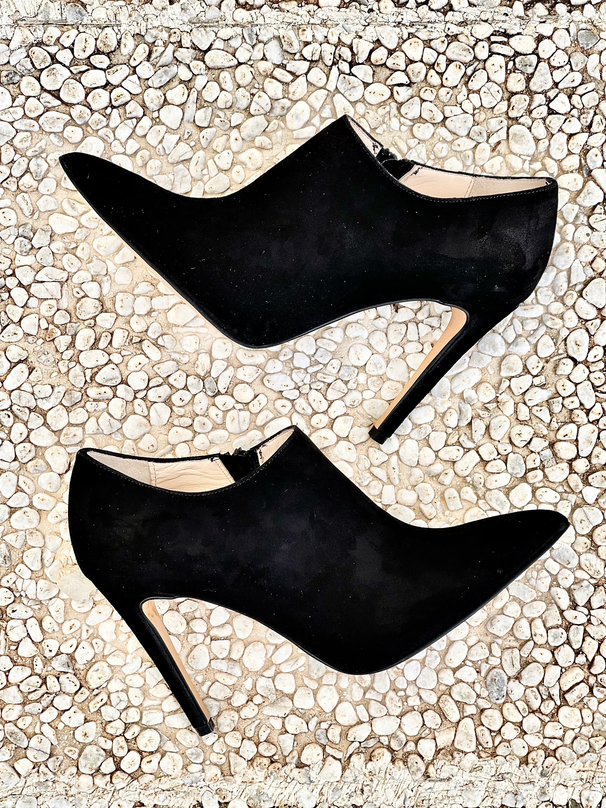 מגף קרסול עם חרטום מחודד מזמש שחור עם עקב סטילטו בגובה 10 ס"מ.