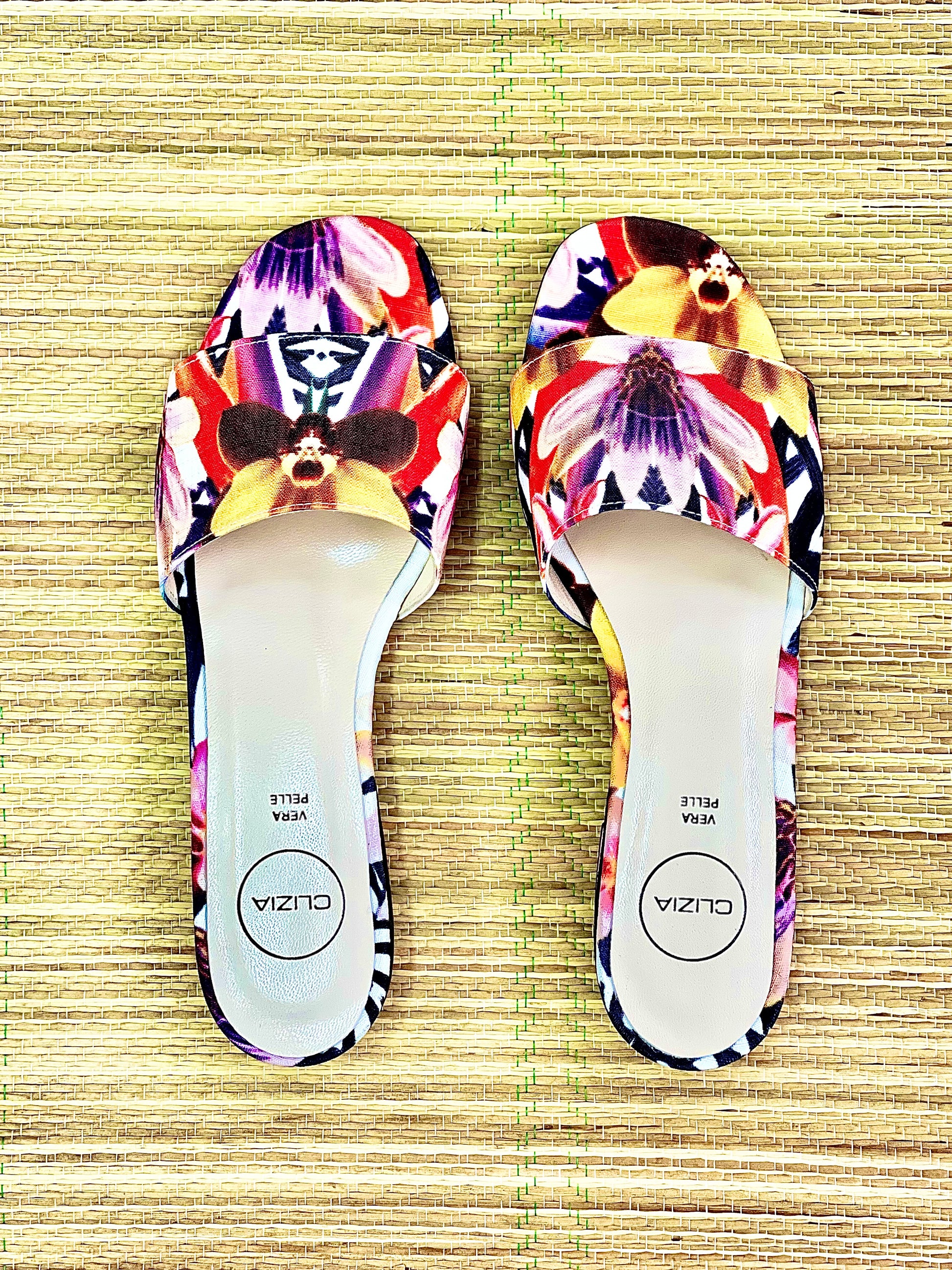 סנדלים נמוכים בגזרת מול מבד פרחוני עם עקב ברוחב 2 ס"מ.