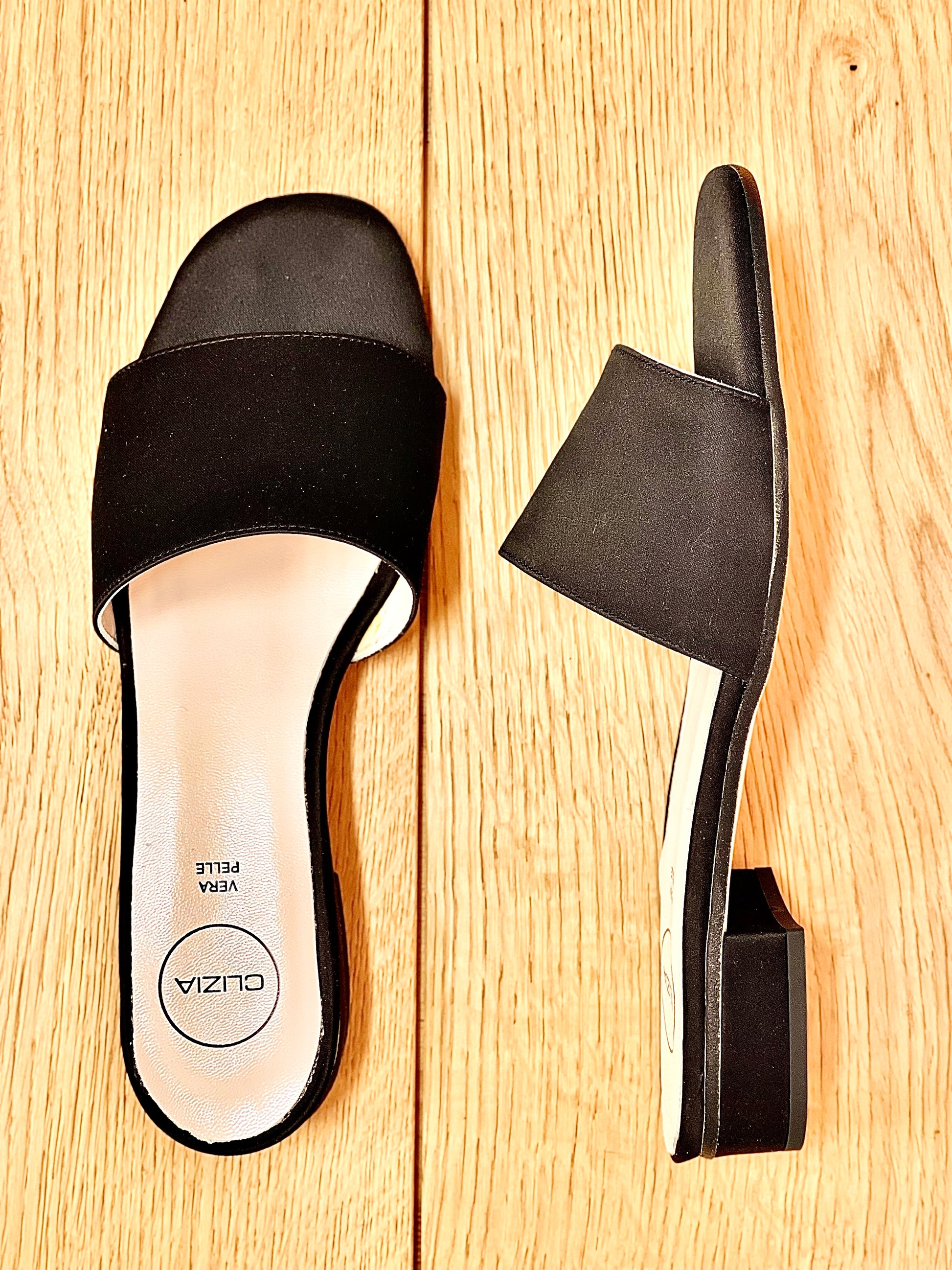סנדלים נמוכים מסאטן עם עקב ברוחב 2 ס"מ.