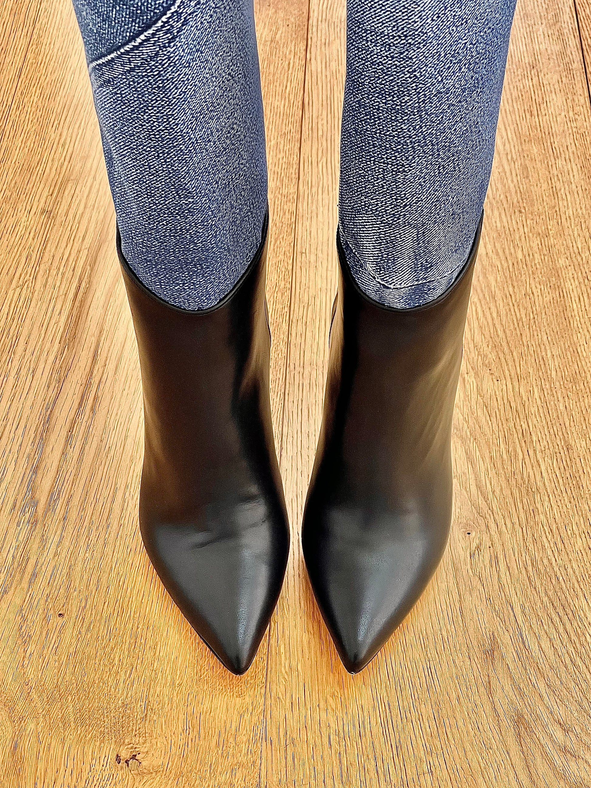 מגפיים צינוריים גבוהים מעור שחור וגזרת ג'ינס כחולה.