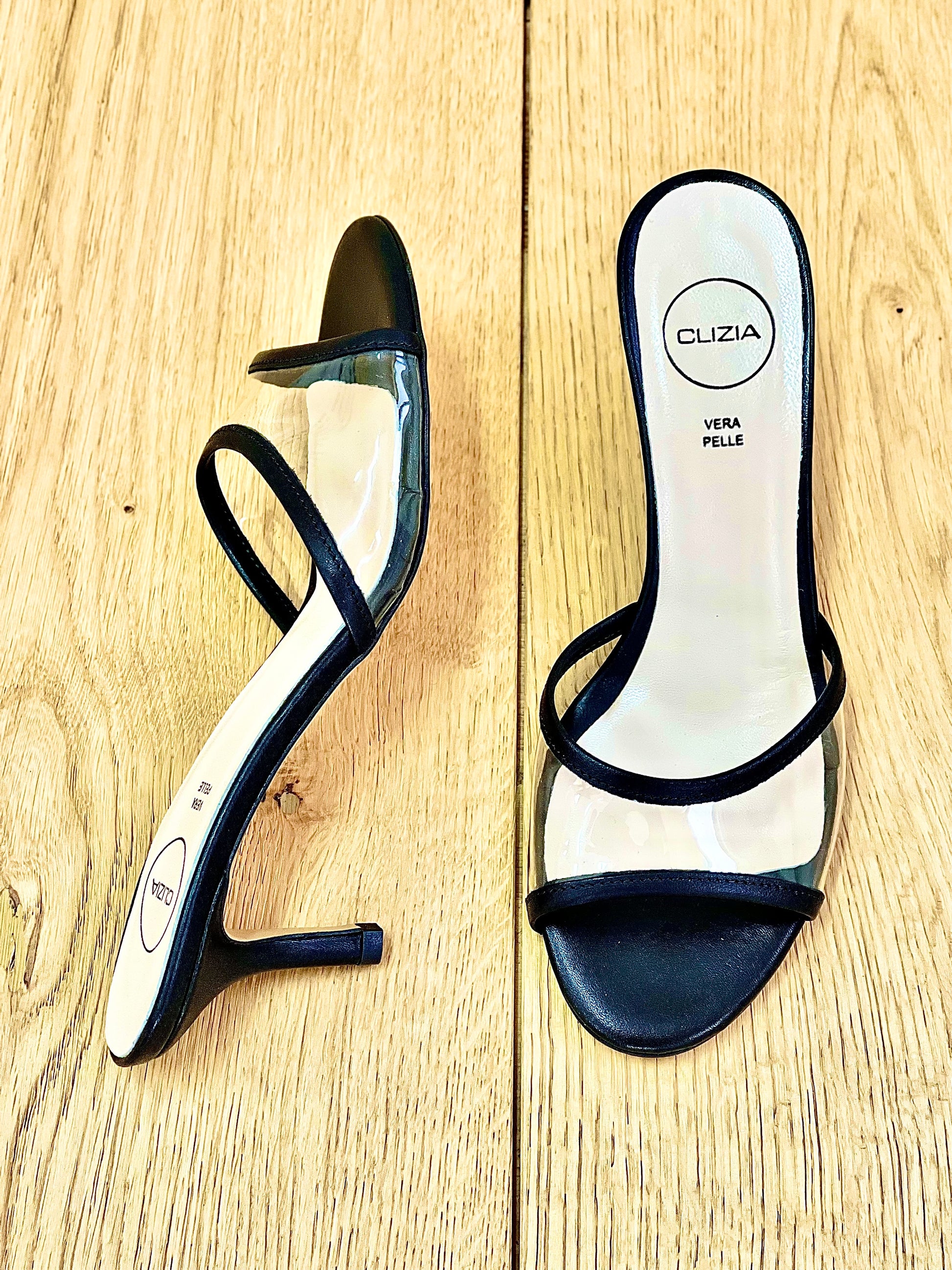 סנדלים שקופים מ-PVC ועור עם עקב 6 ס"מ.