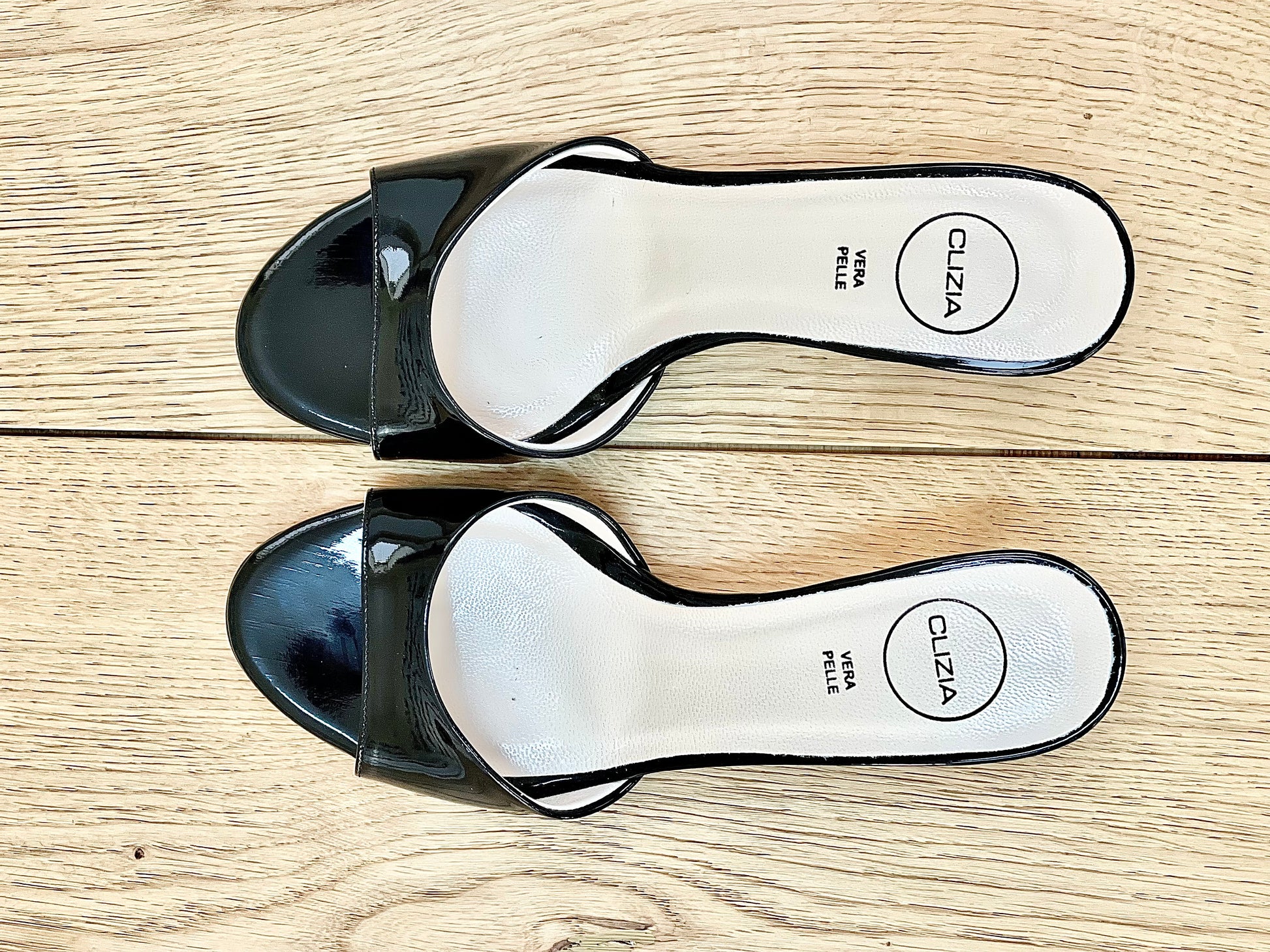 סנדלים נמוכים מעור פטנט עם עקב סטילטו בגובה 6 ס"מ.