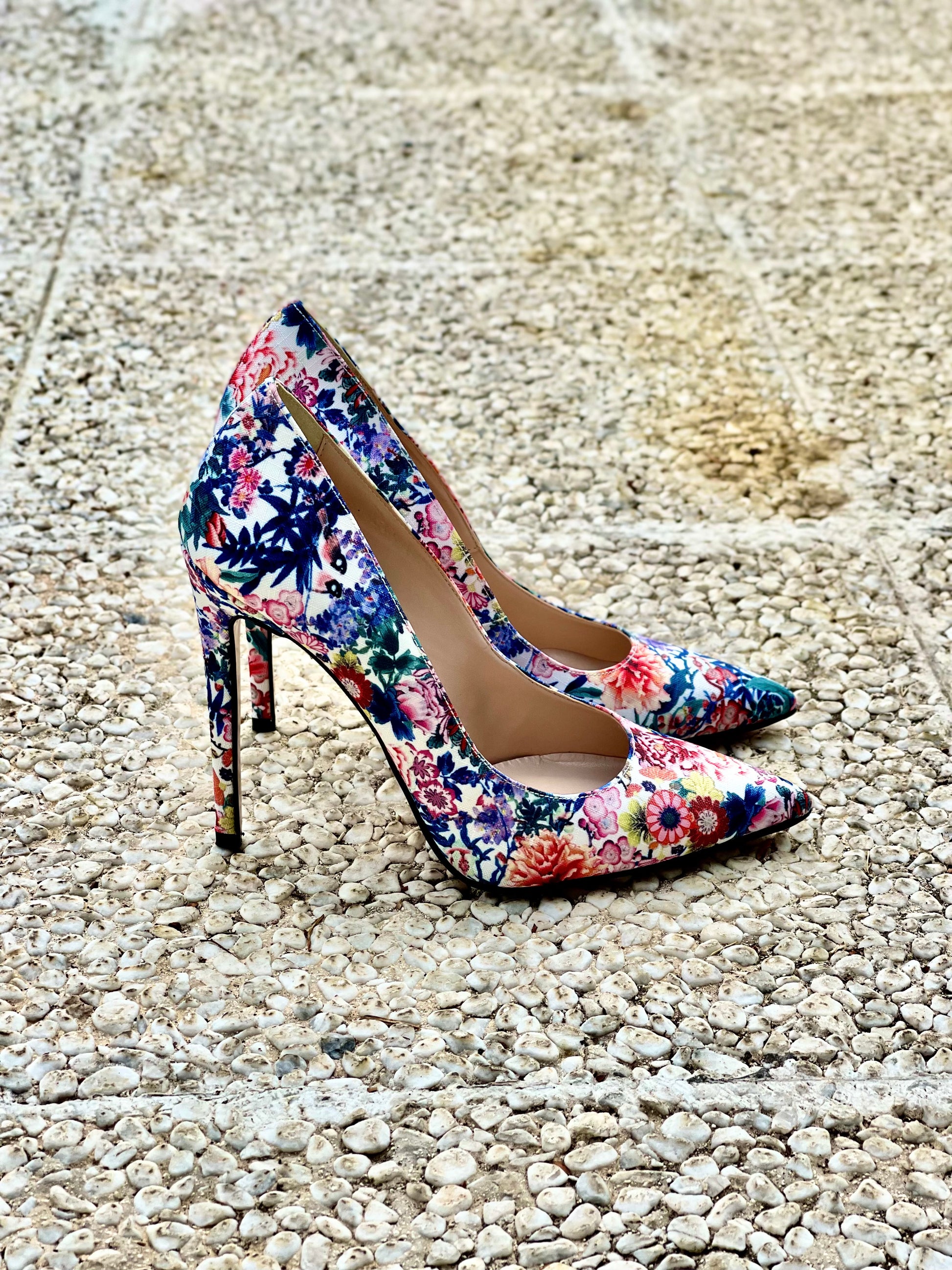 דקולטה מחודדת מבד פרחוני עם עקב 10 ס"מ.