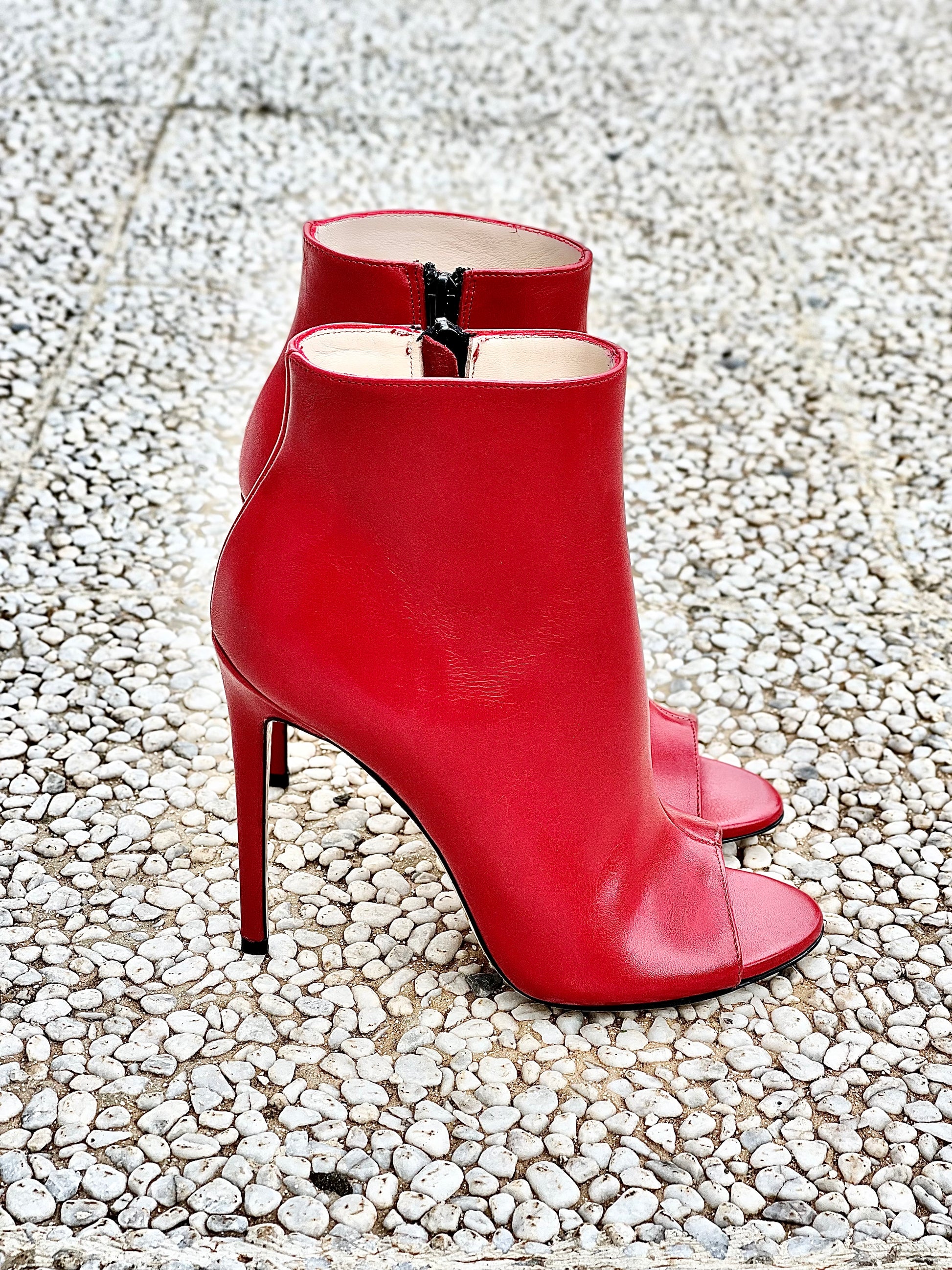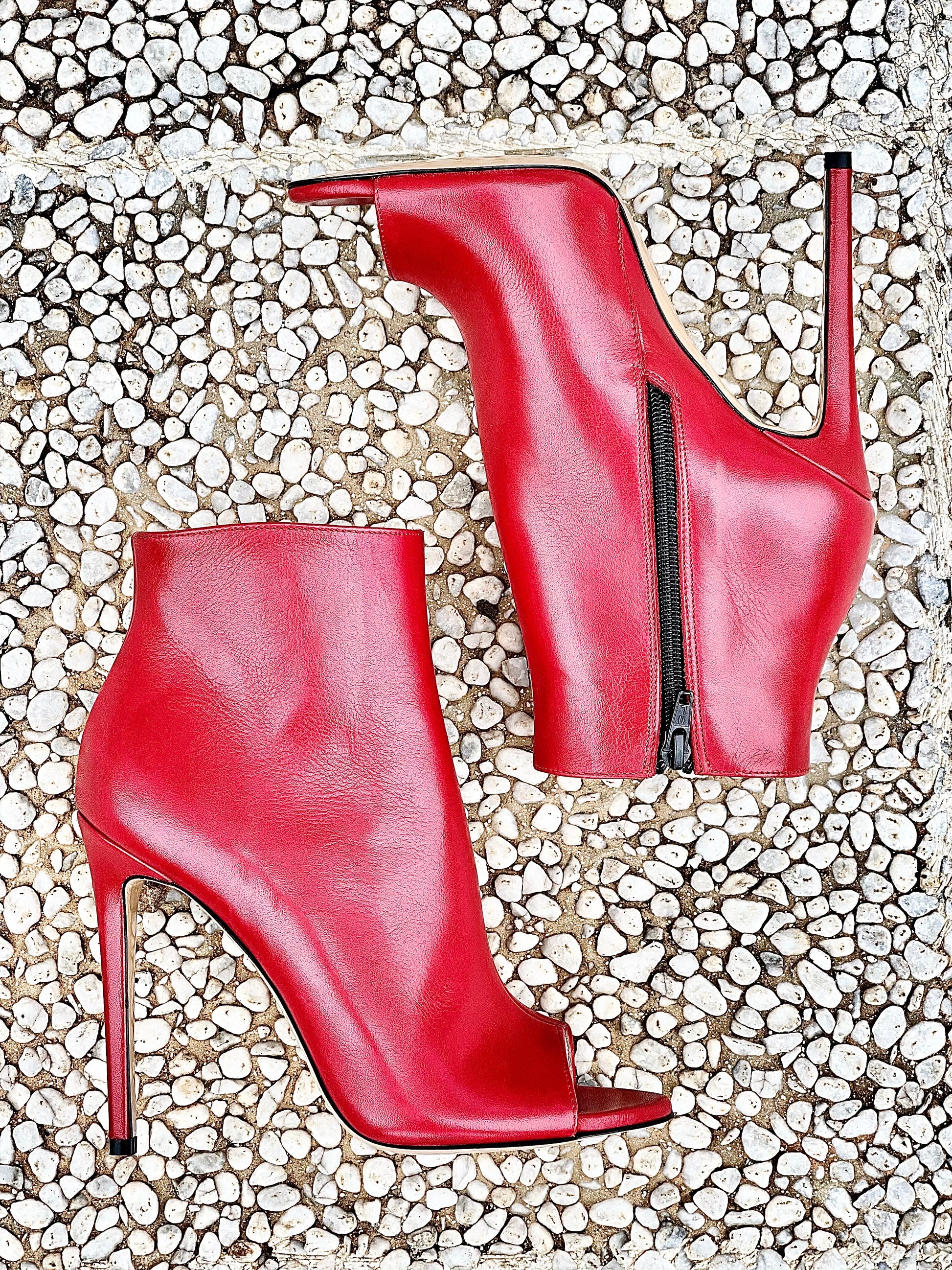 מגפוני עור פתוחים עם עקב סטילטו בגובה 12 ס"מ.