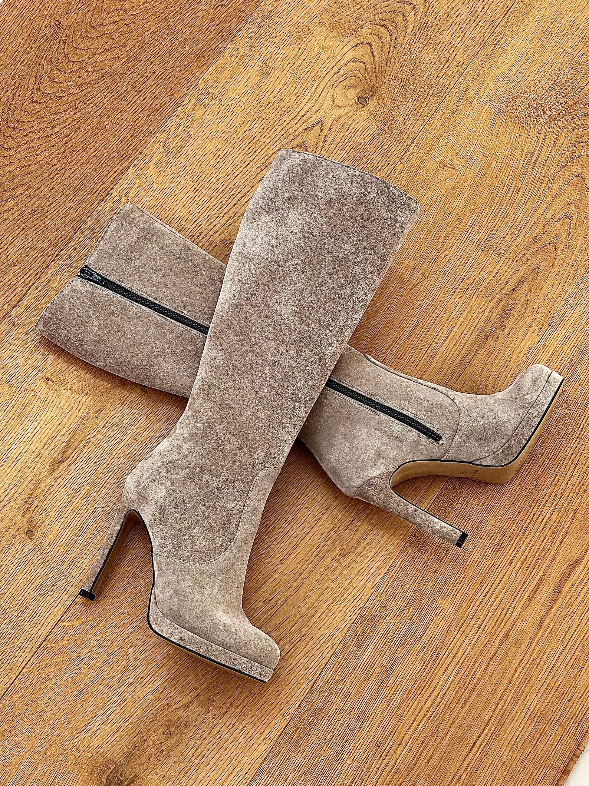 מגפיים גבוהים אלגנטיים עם חרטום עגול ופלטפורמה.