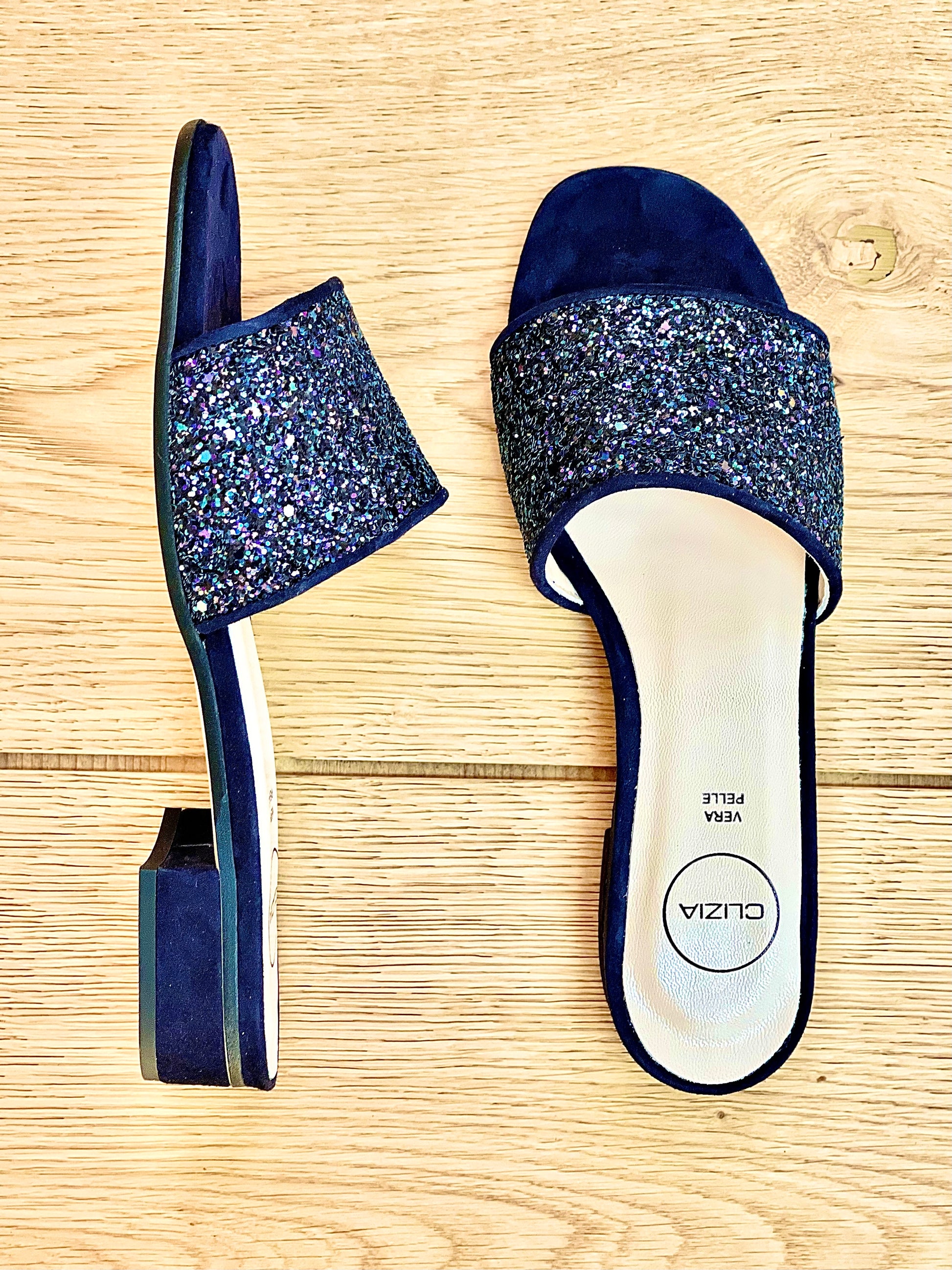 סנדלים נמוכים בסגנון מיול מזמש ונצנצים עם עקב בגובה 2 ס"מ.