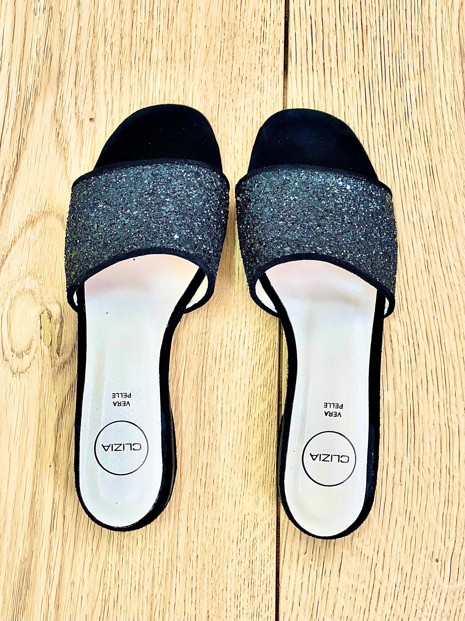 סנדלים נמוכים בסגנון מיול מזמש ונצנצים עם עקב בגובה 2 ס"מ.