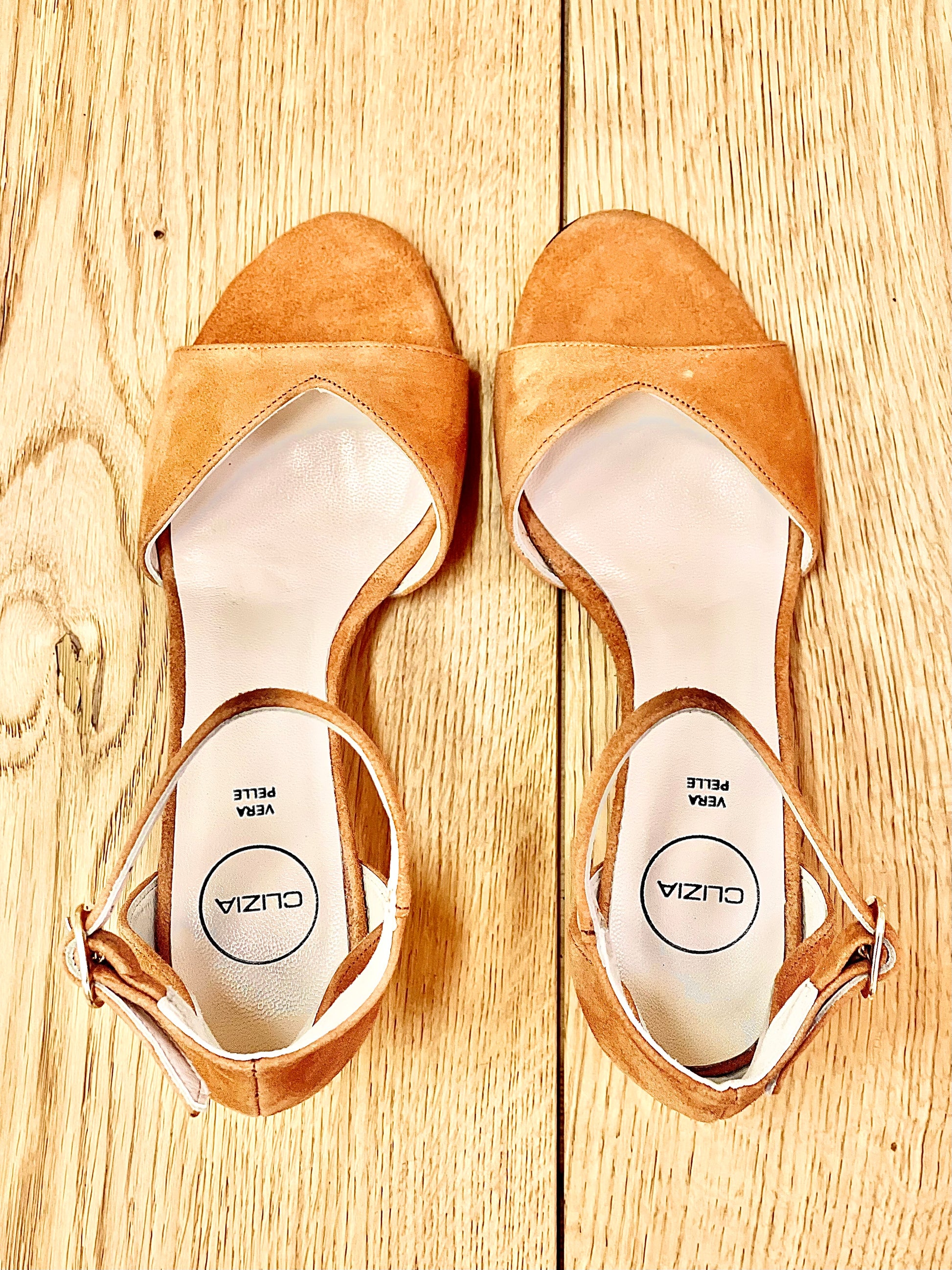סנדלים מזמש עם צווארון V, רצועה ועקב ועקב 6 ס"מ.