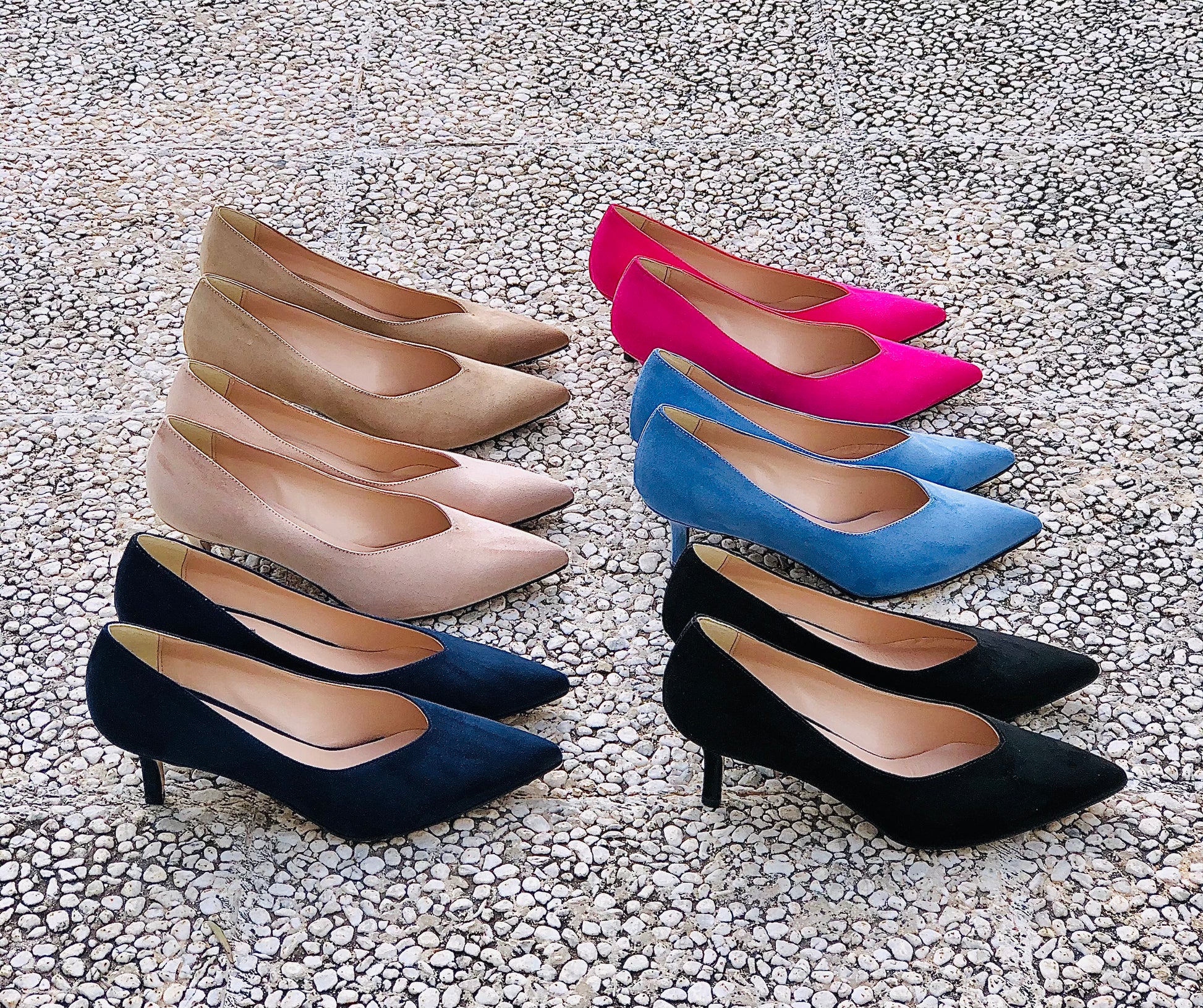 נעלי עקב מזמש עם חרטום מחודד, צווארון V, עקב 6 ס"מ.