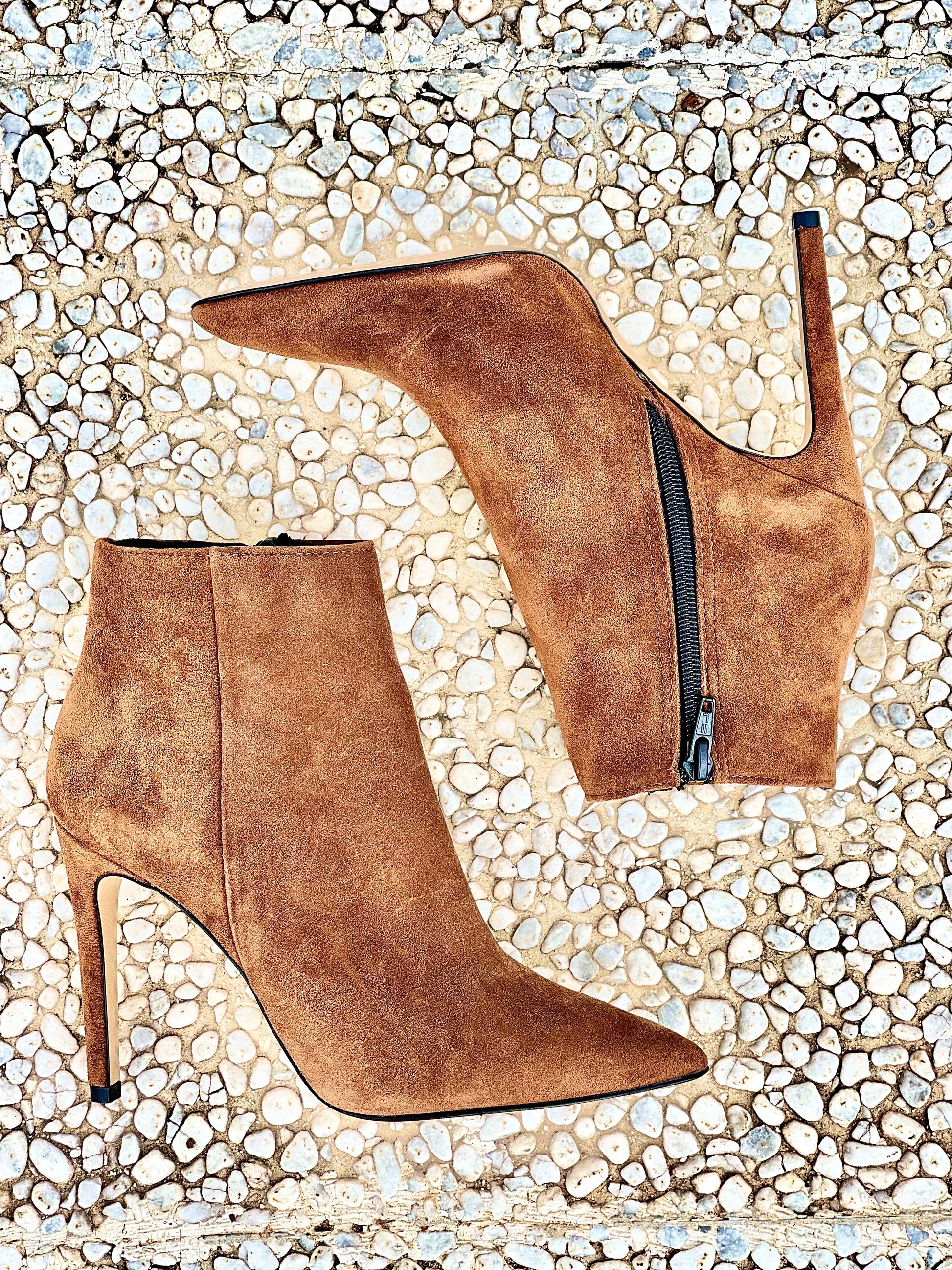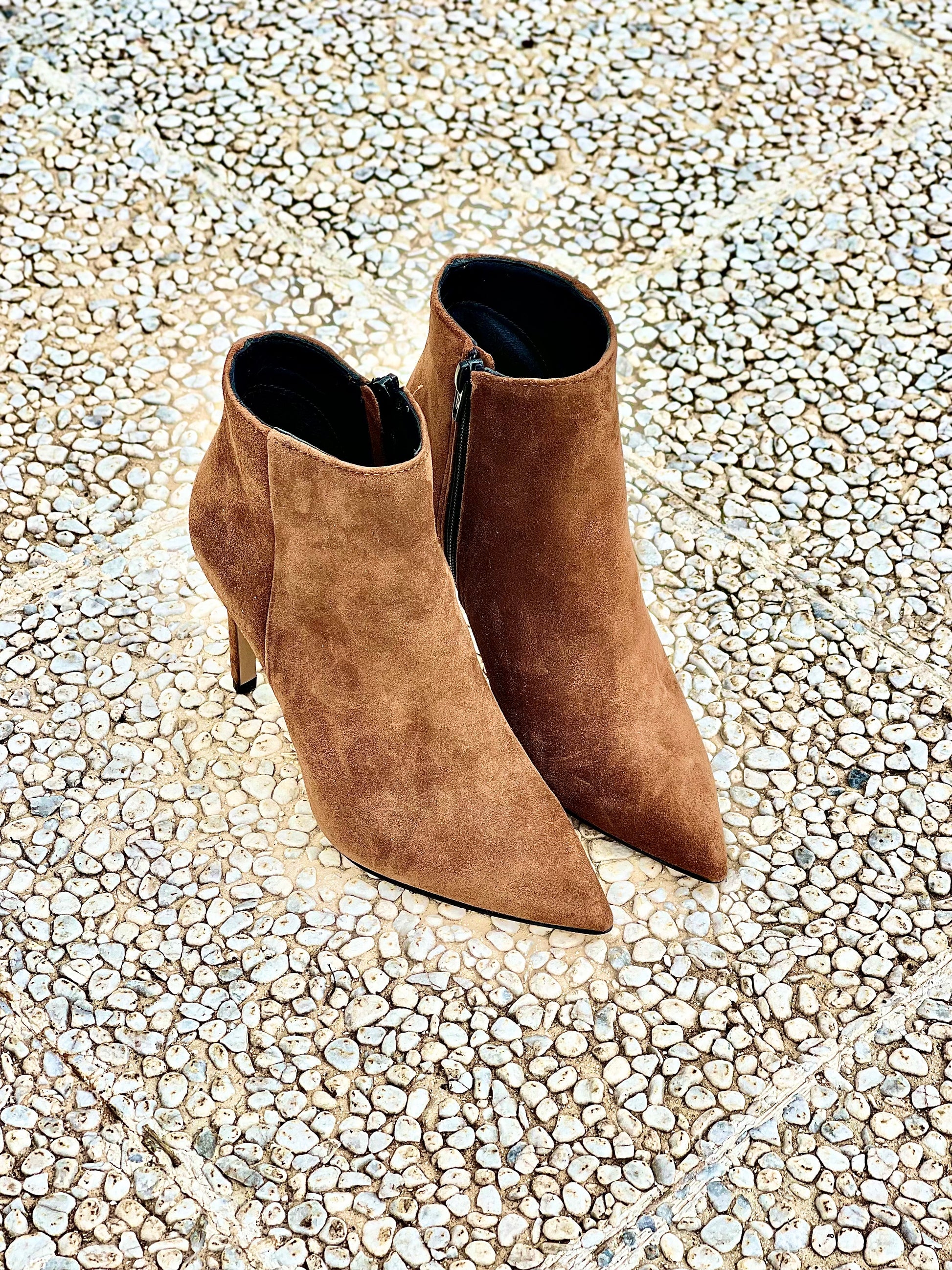 מגפוני קרסול מזמש עם חרטום מחודד ועקב סטילטו 10 ס"מ.