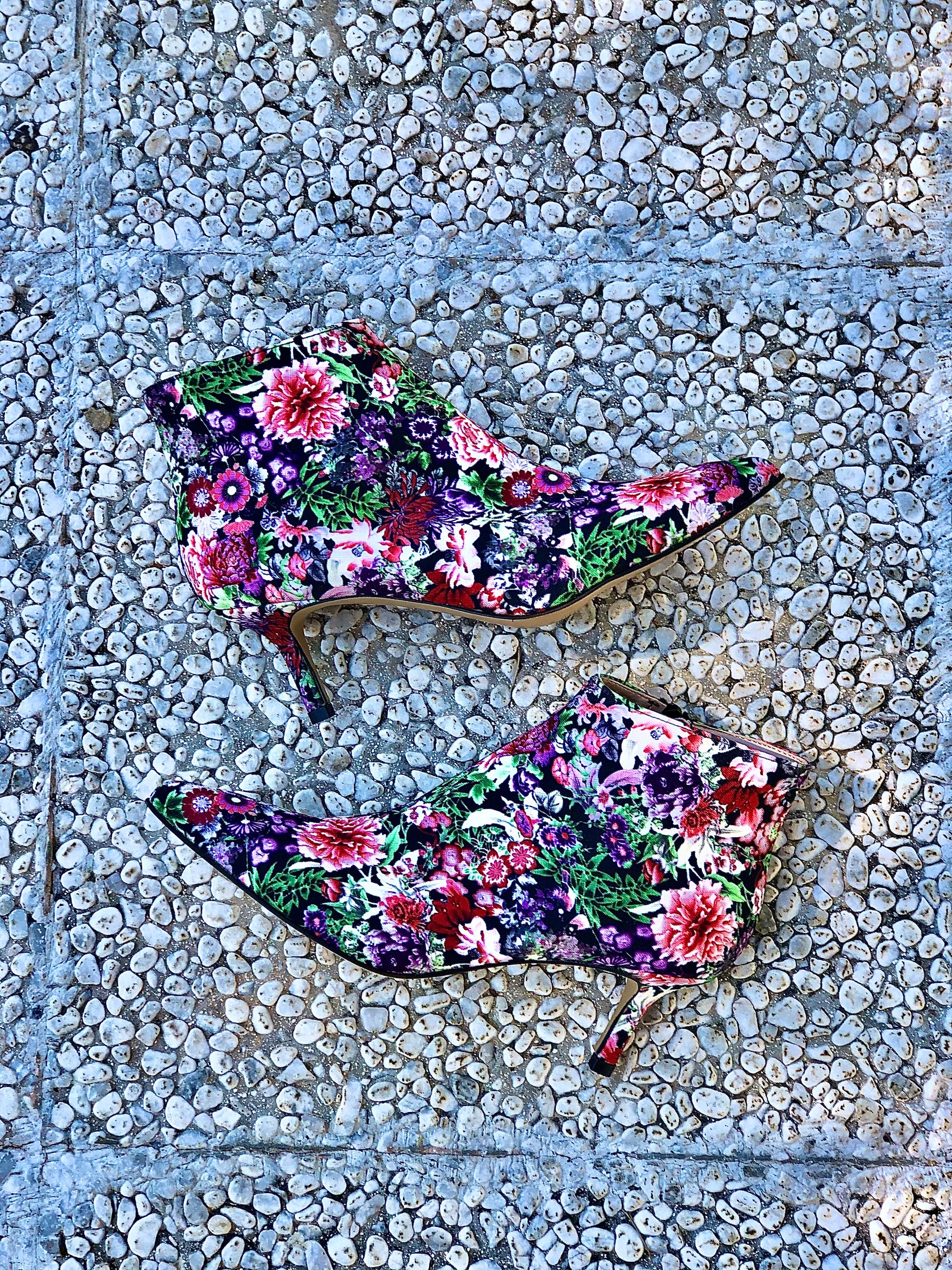מגפון קרסול עם חרטום מחודד מבד פרחוני ועקב 6 ס"מ.