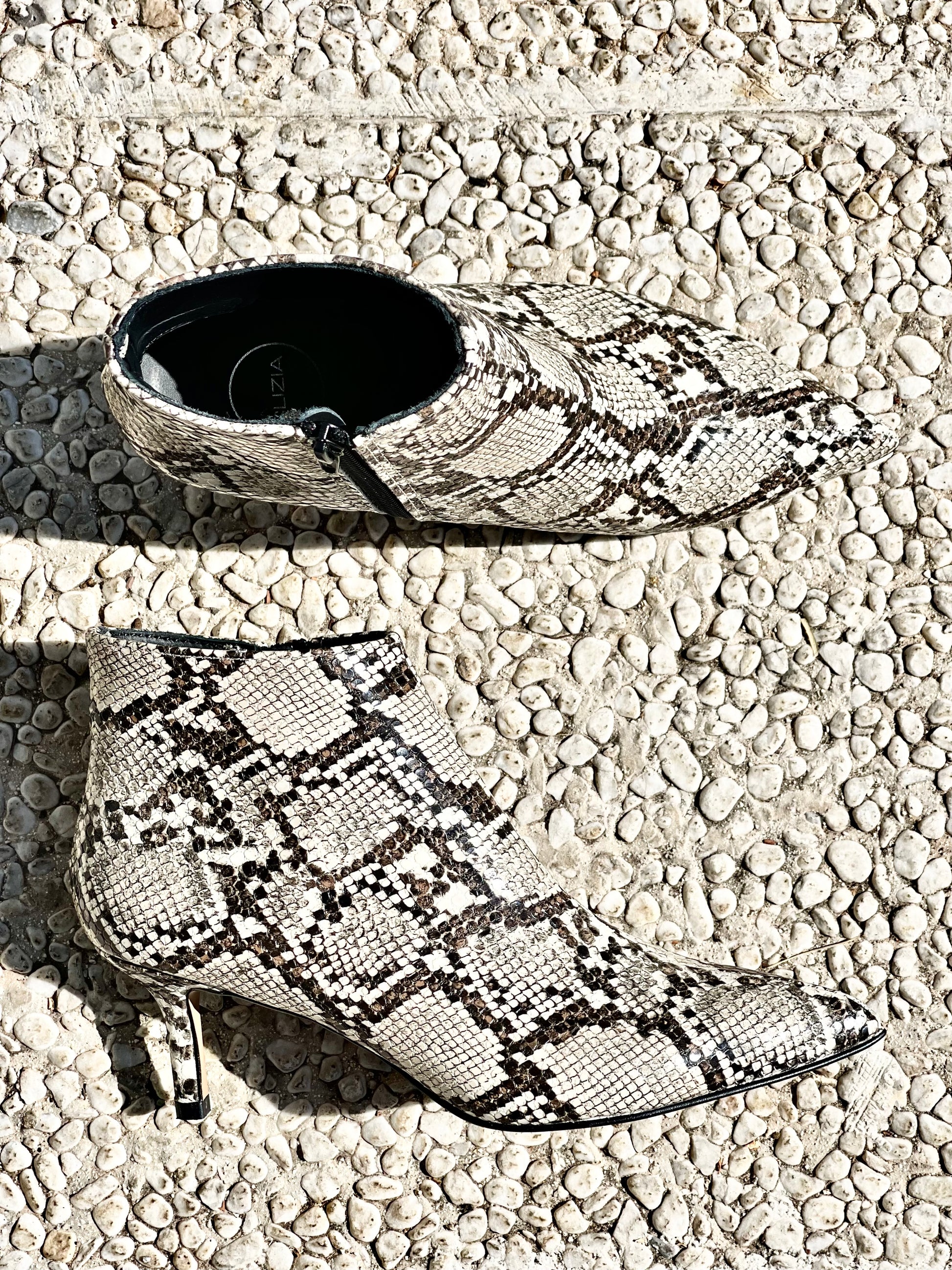 מגף קרסול עם חרטום מחודד מבד בהדפס פיתון ועקב בגובה 6 ס"מ.