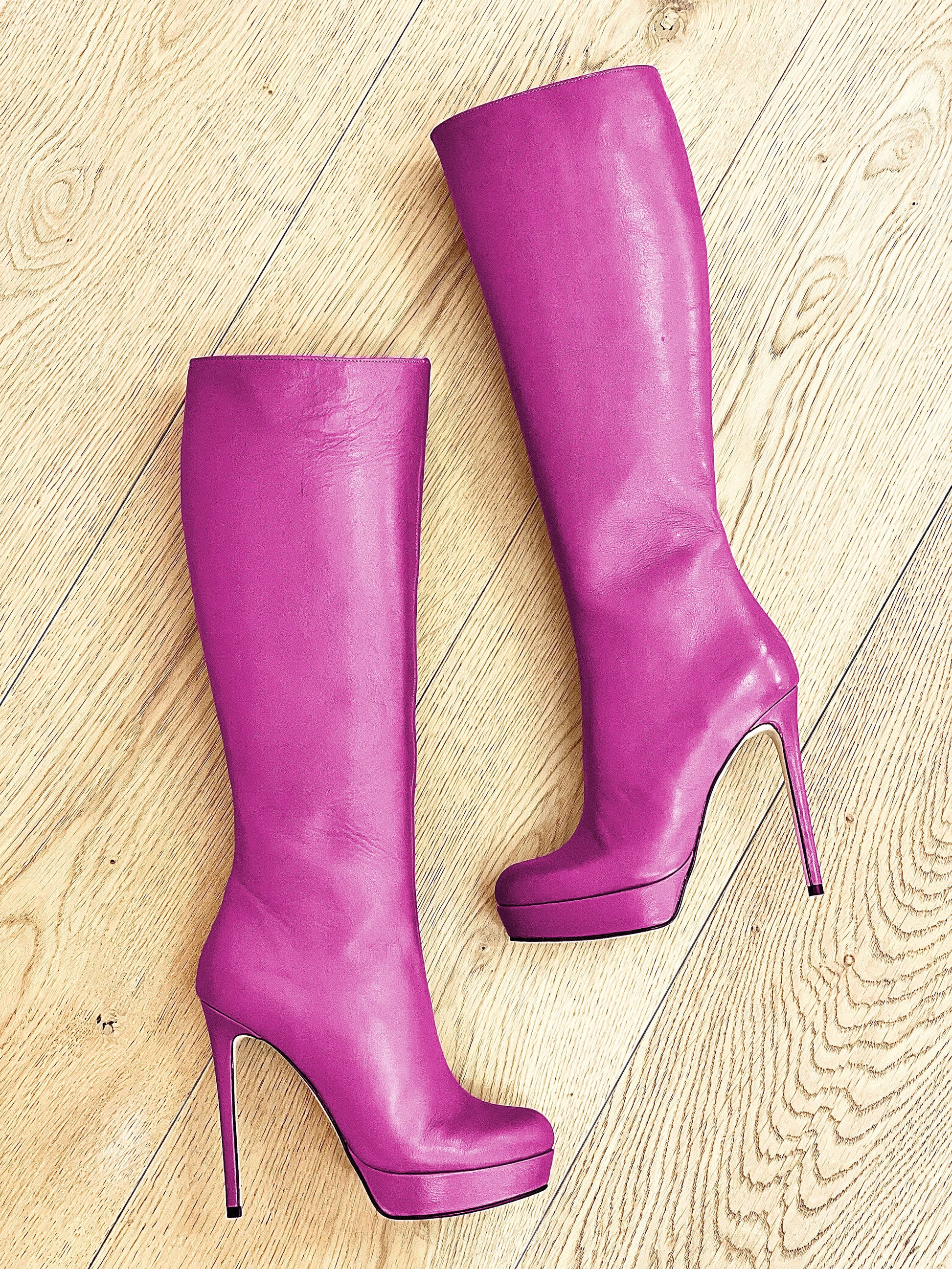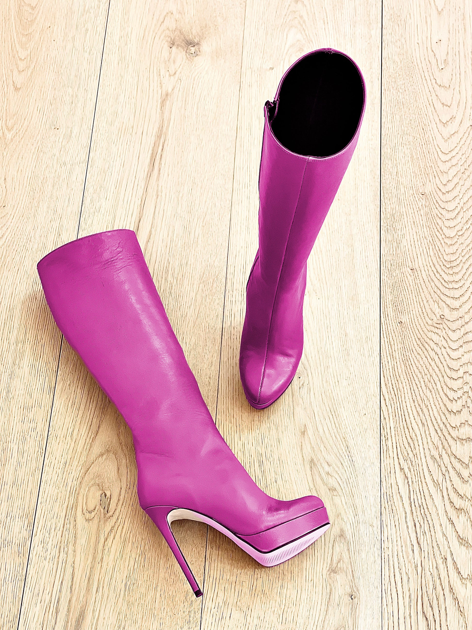 מגפי עור גבוהים עם חרטום עגול, פלטפורמה ועקב סטילטו.