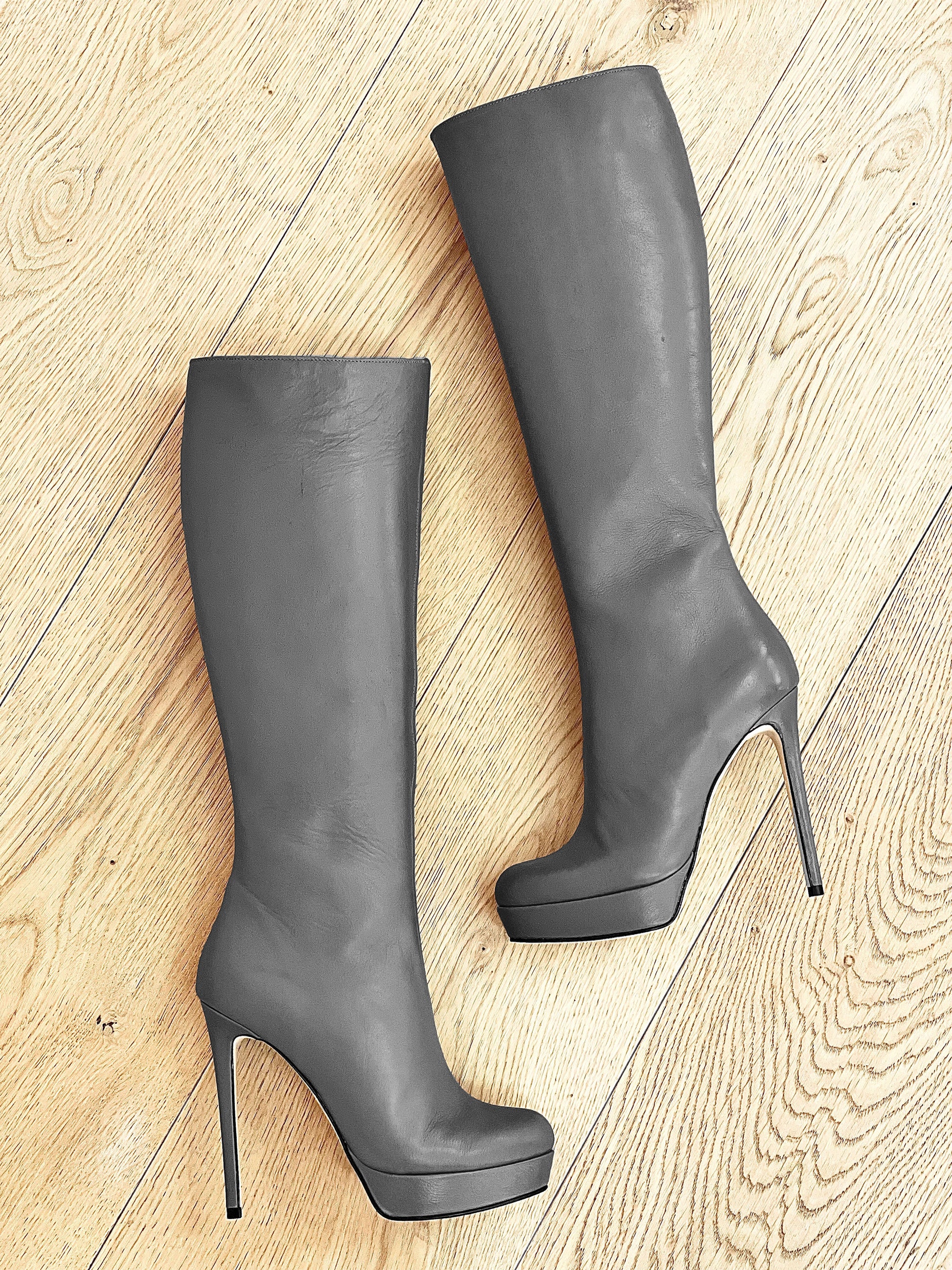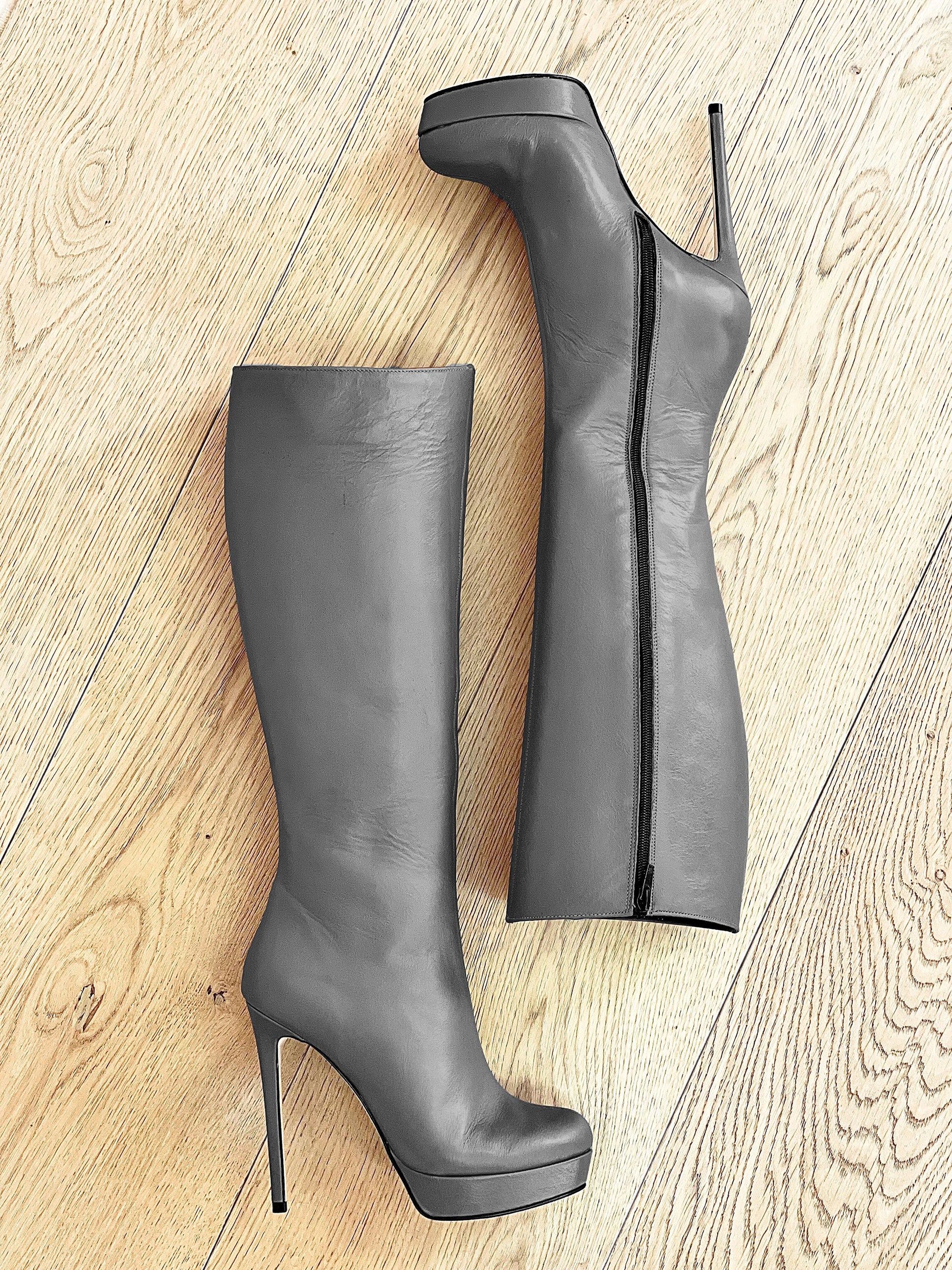 מגפי עור גבוהים עם חרטום עגול, פלטפורמה ועקב סטילטו.
