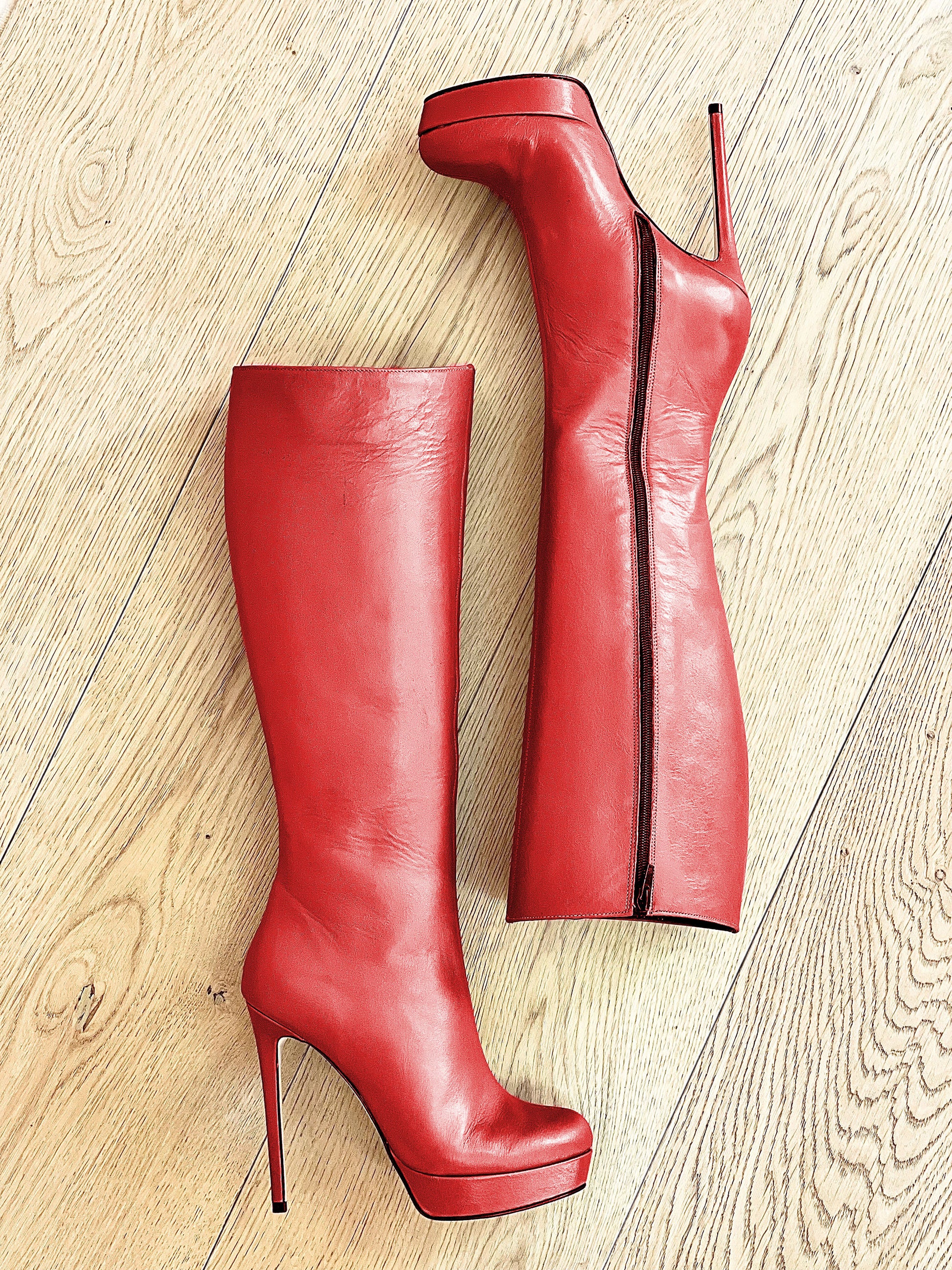 מגפי עור גבוהים עם חרטום עגול, פלטפורמה ועקב סטילטו.