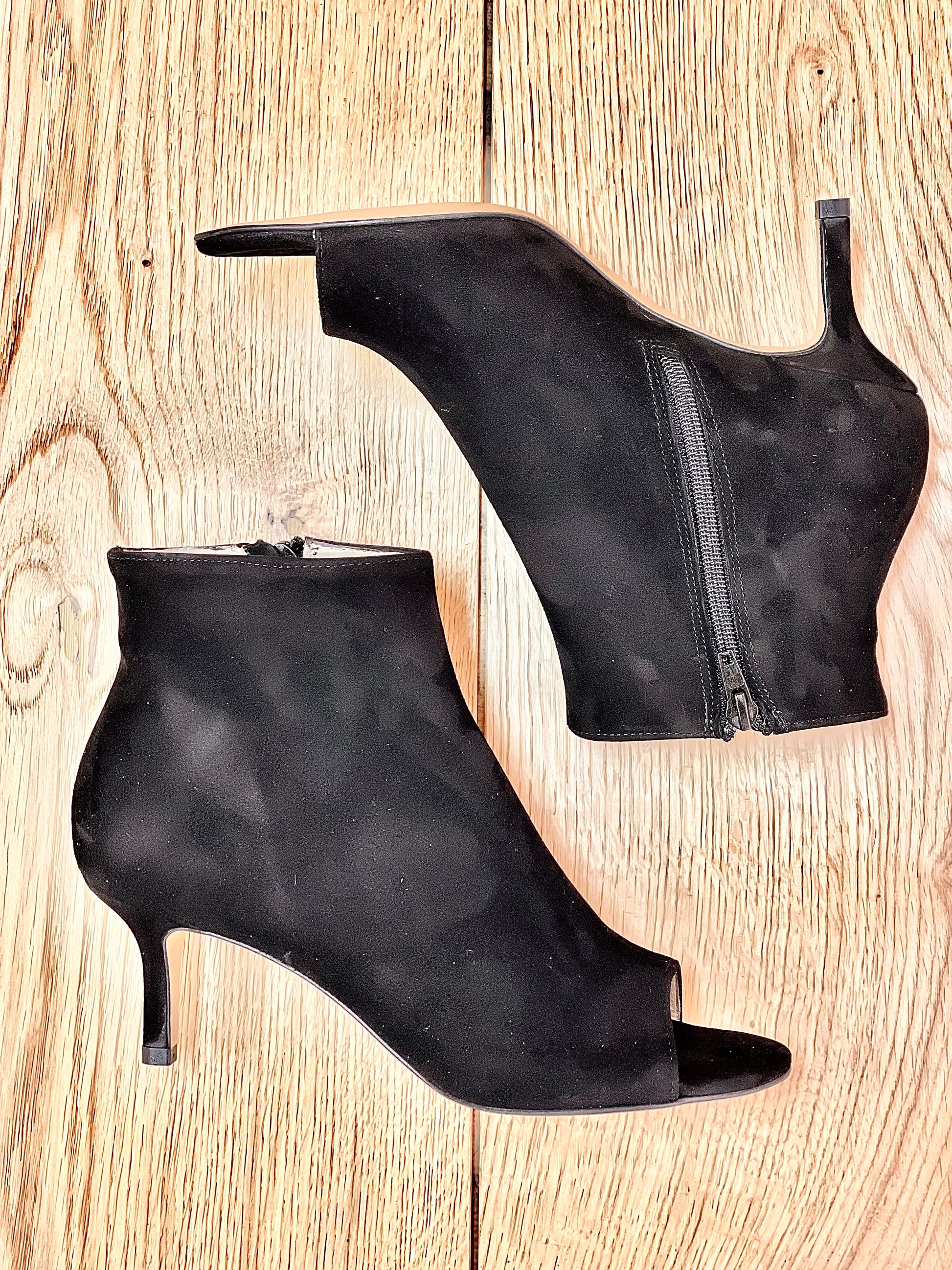 Suède enkellaarsjes met een hak van 6 cm.