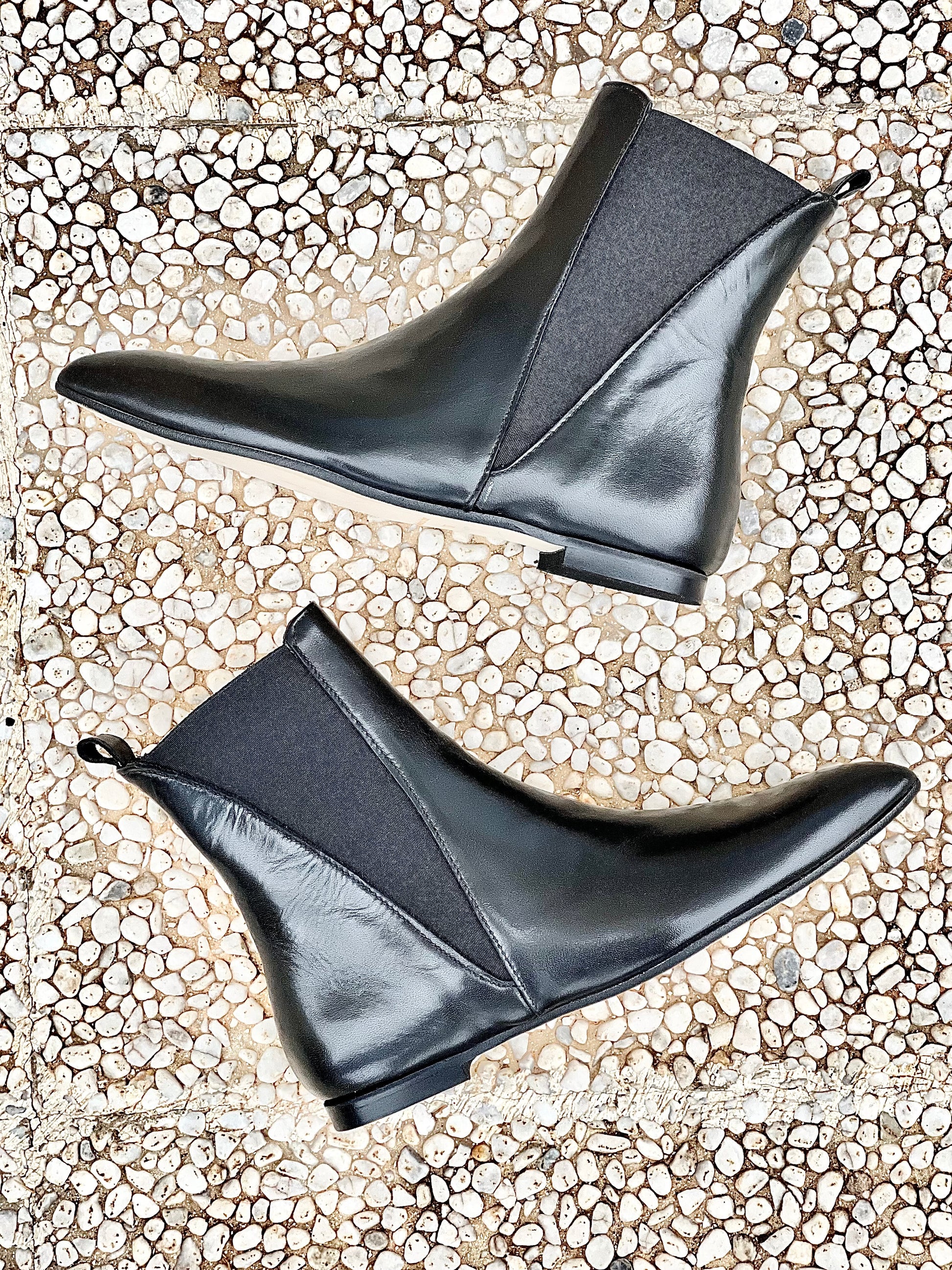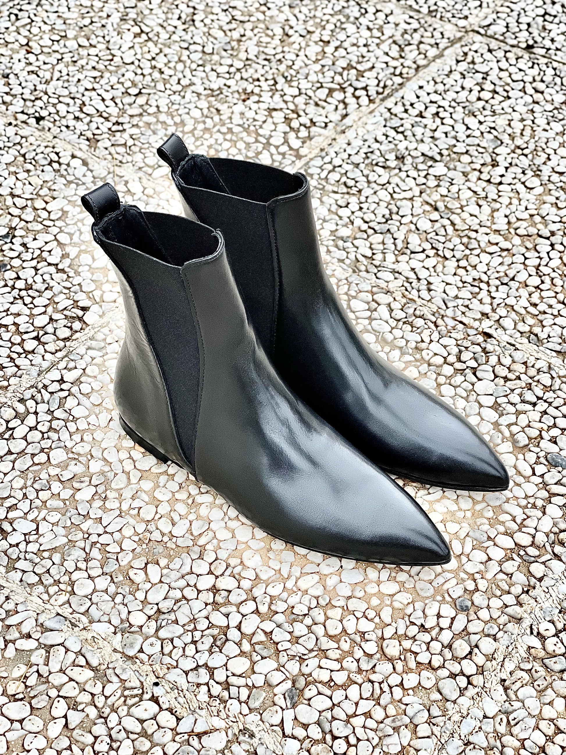 Platte chelsea-laars van leer met een hak van 1 cm.