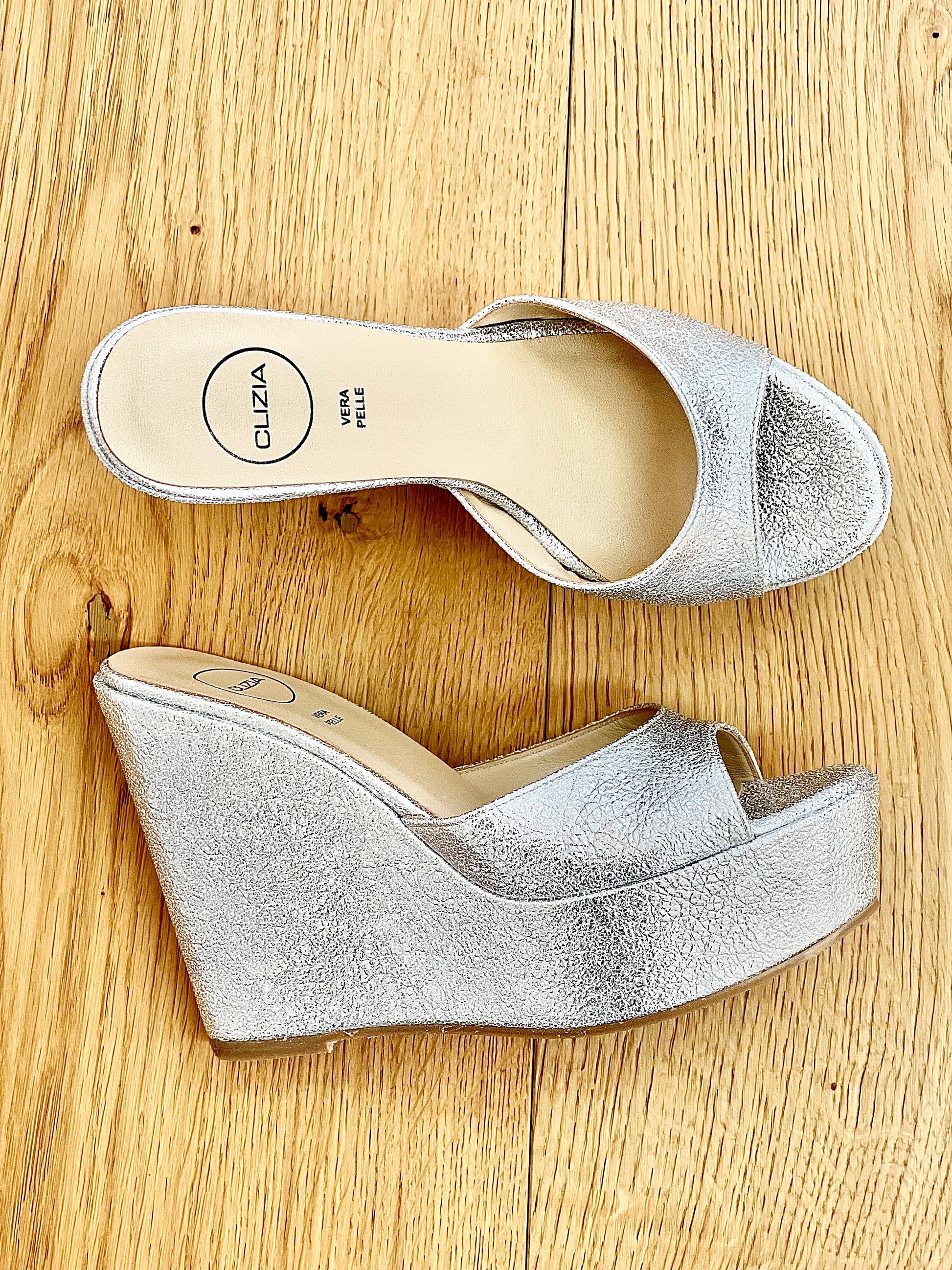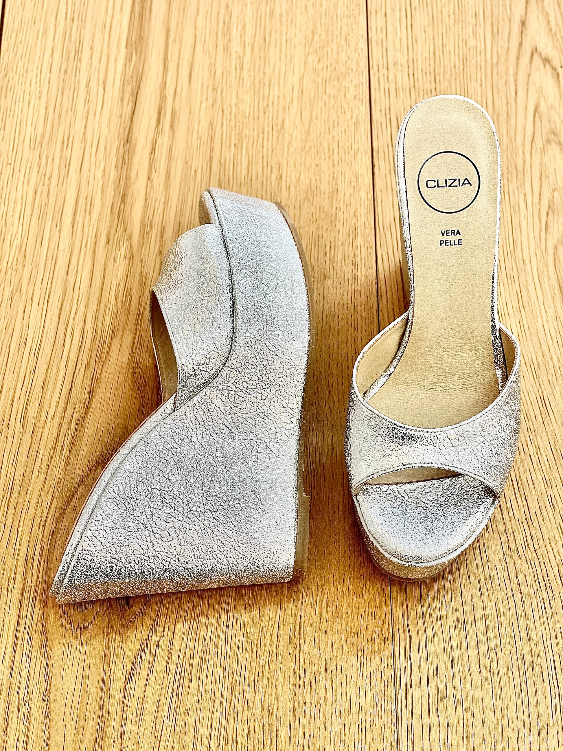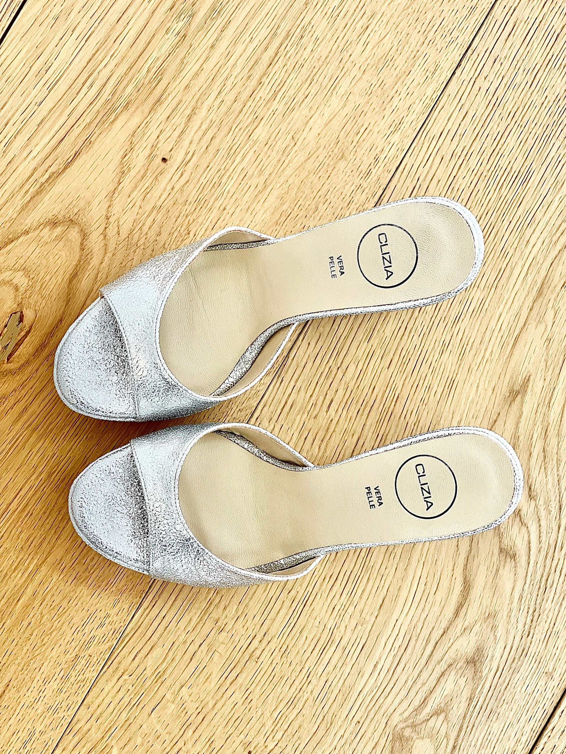 Gelamineerde hoge muiltjes sandalen met sleehak.