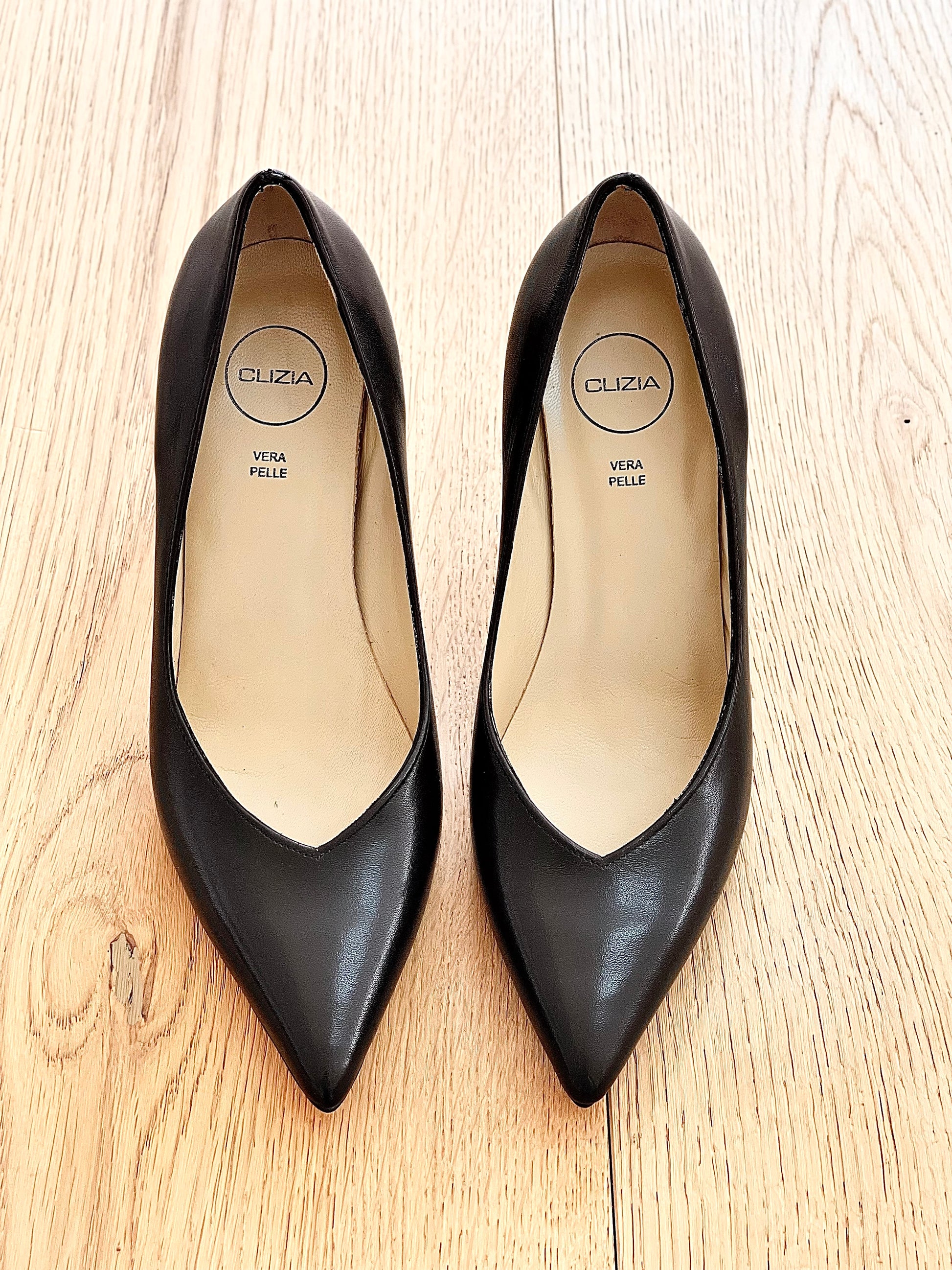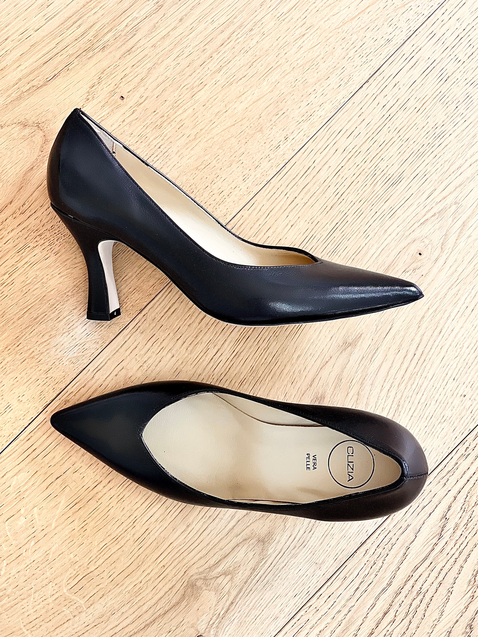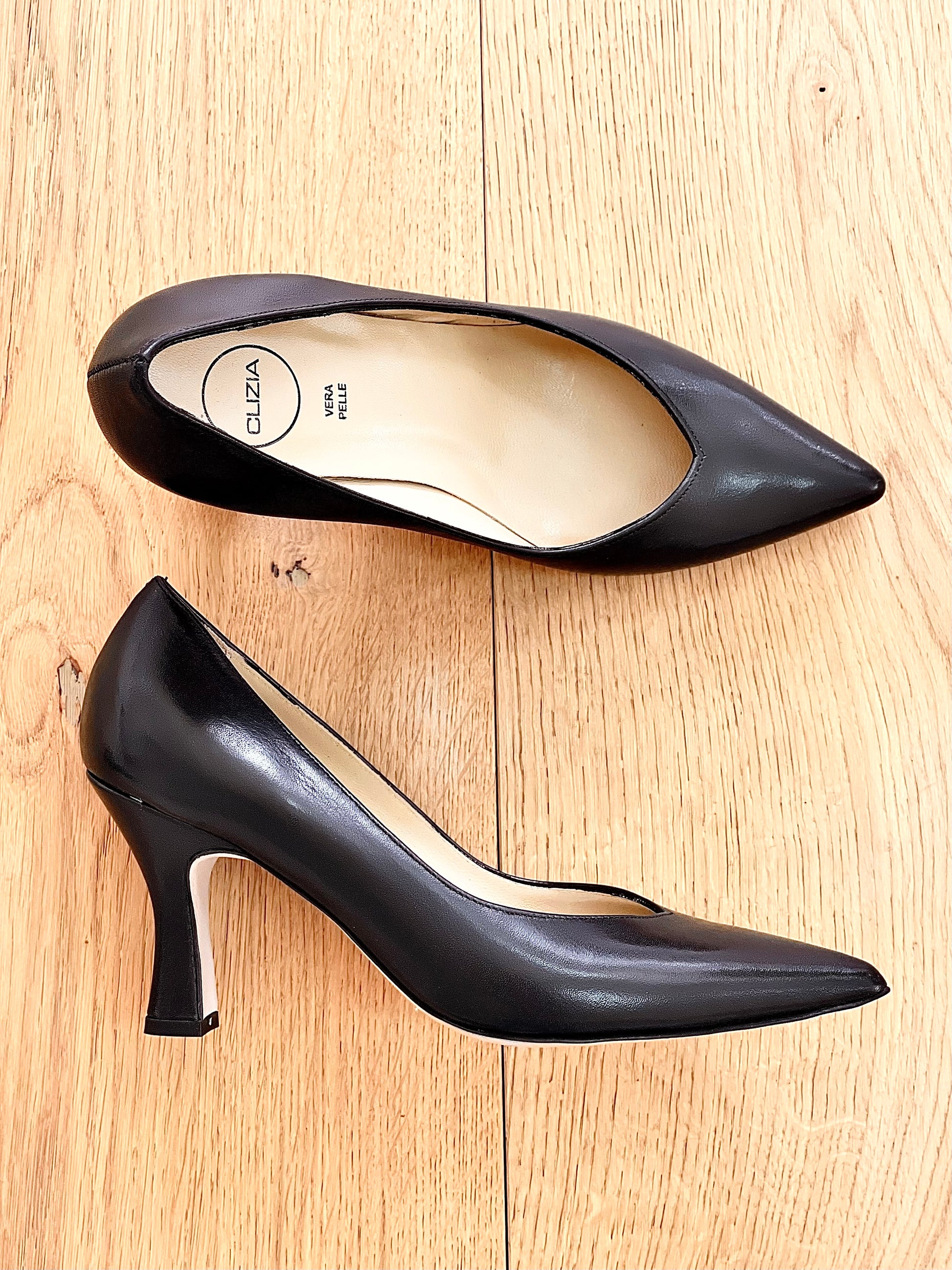 Spitse V-hals pump van leer met een hak van 8 cm.
