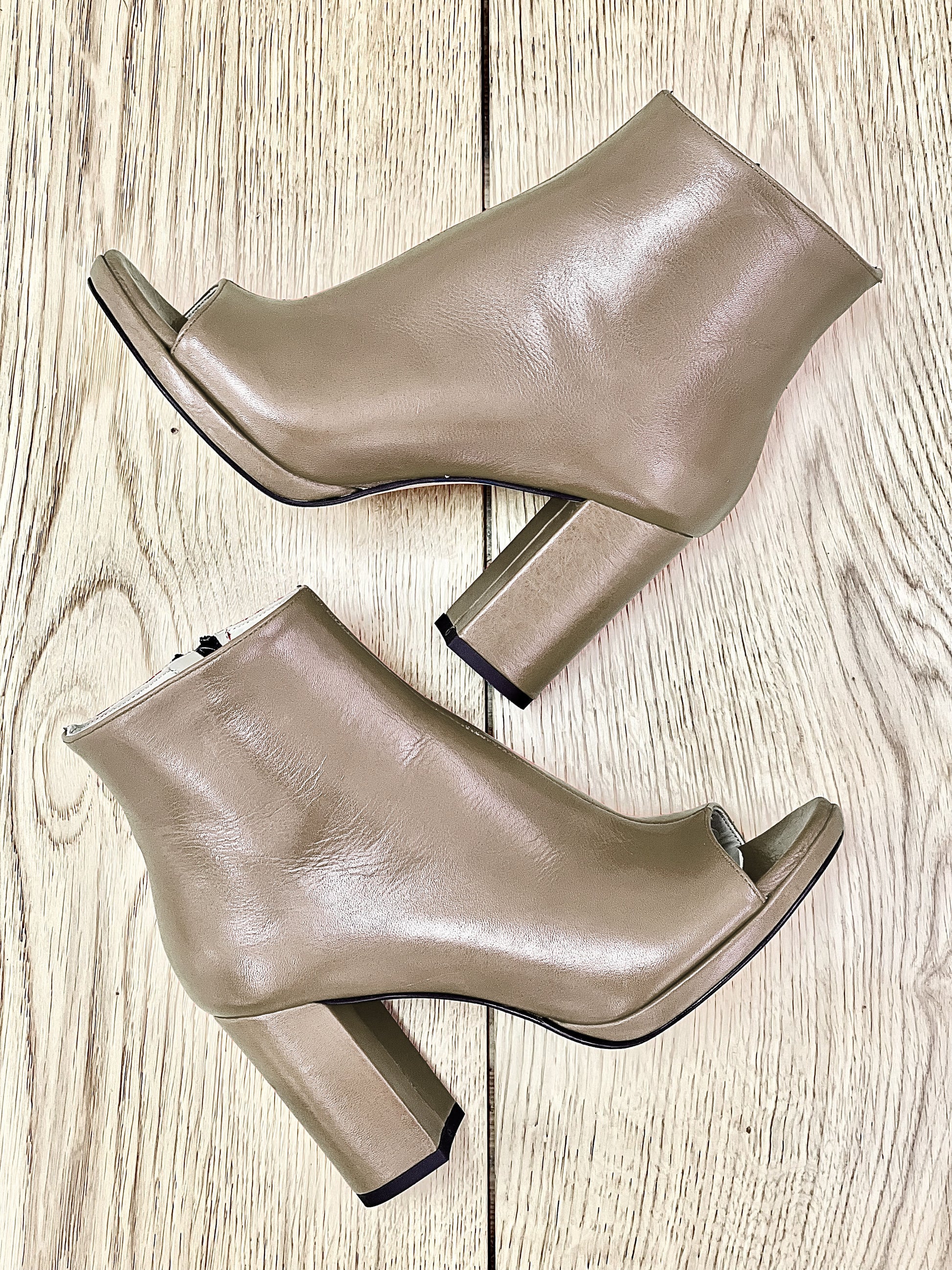 Leren enkellaarsjes met open teen, plateau en brede hak.