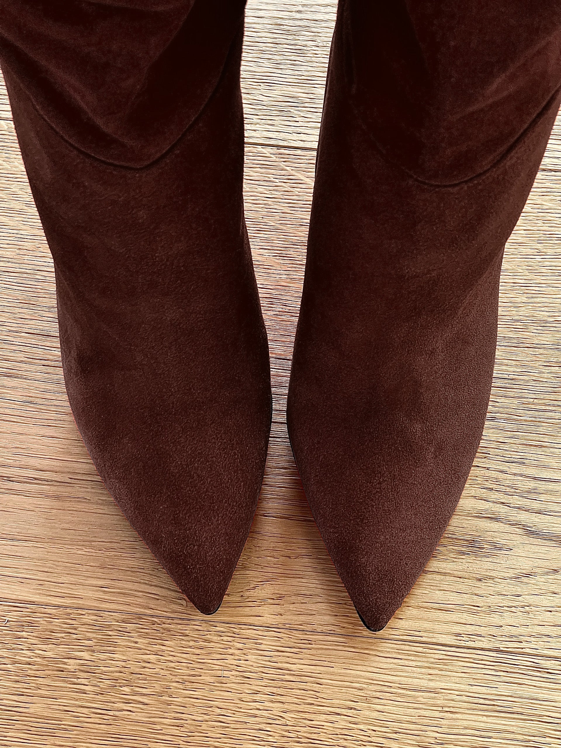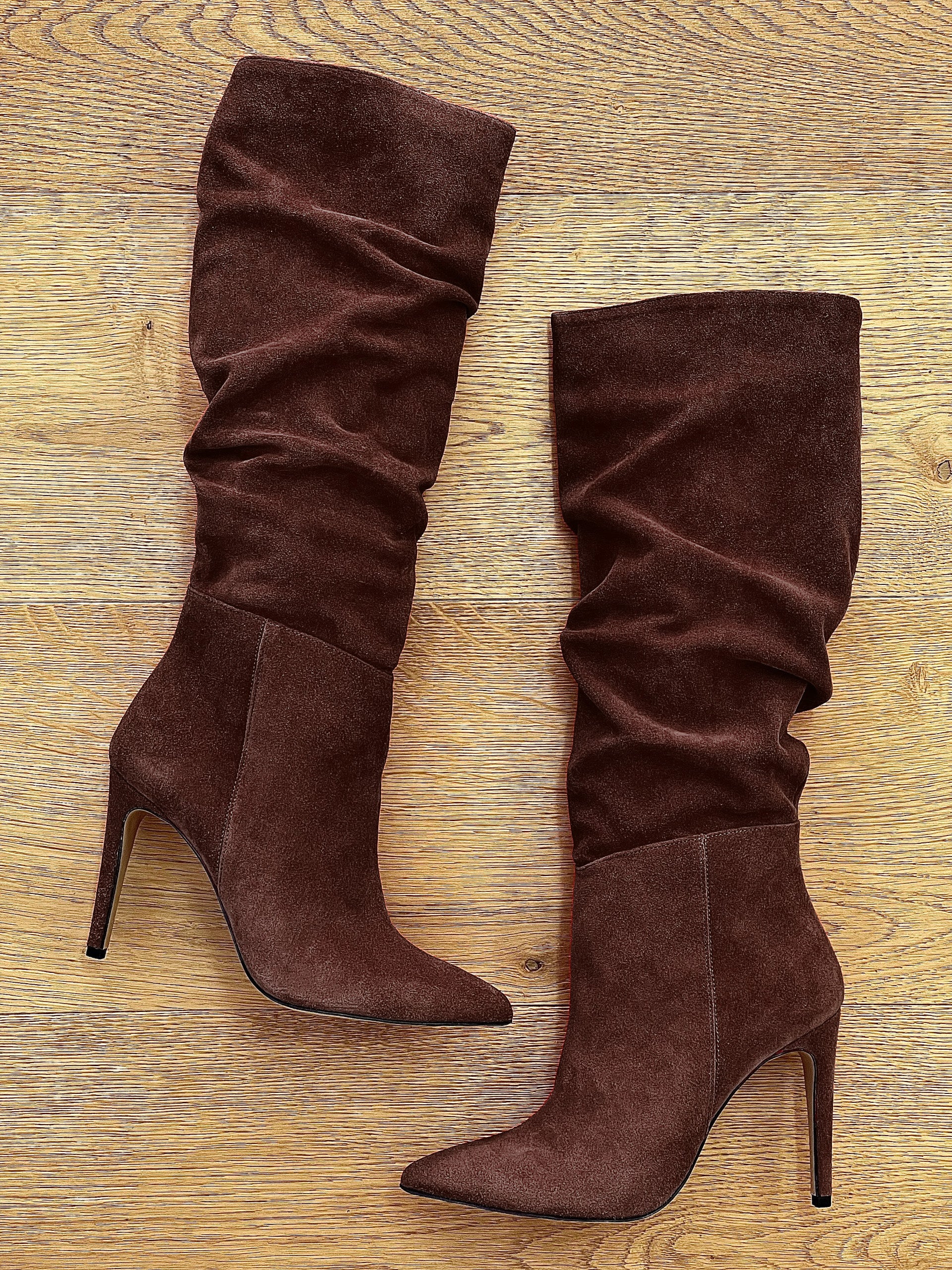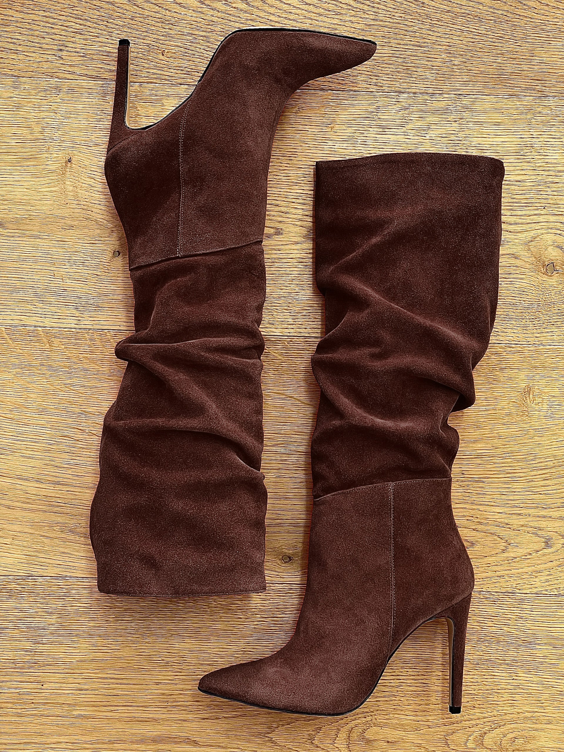 Hoge doorgezakte suède laarzen met naaldhak.