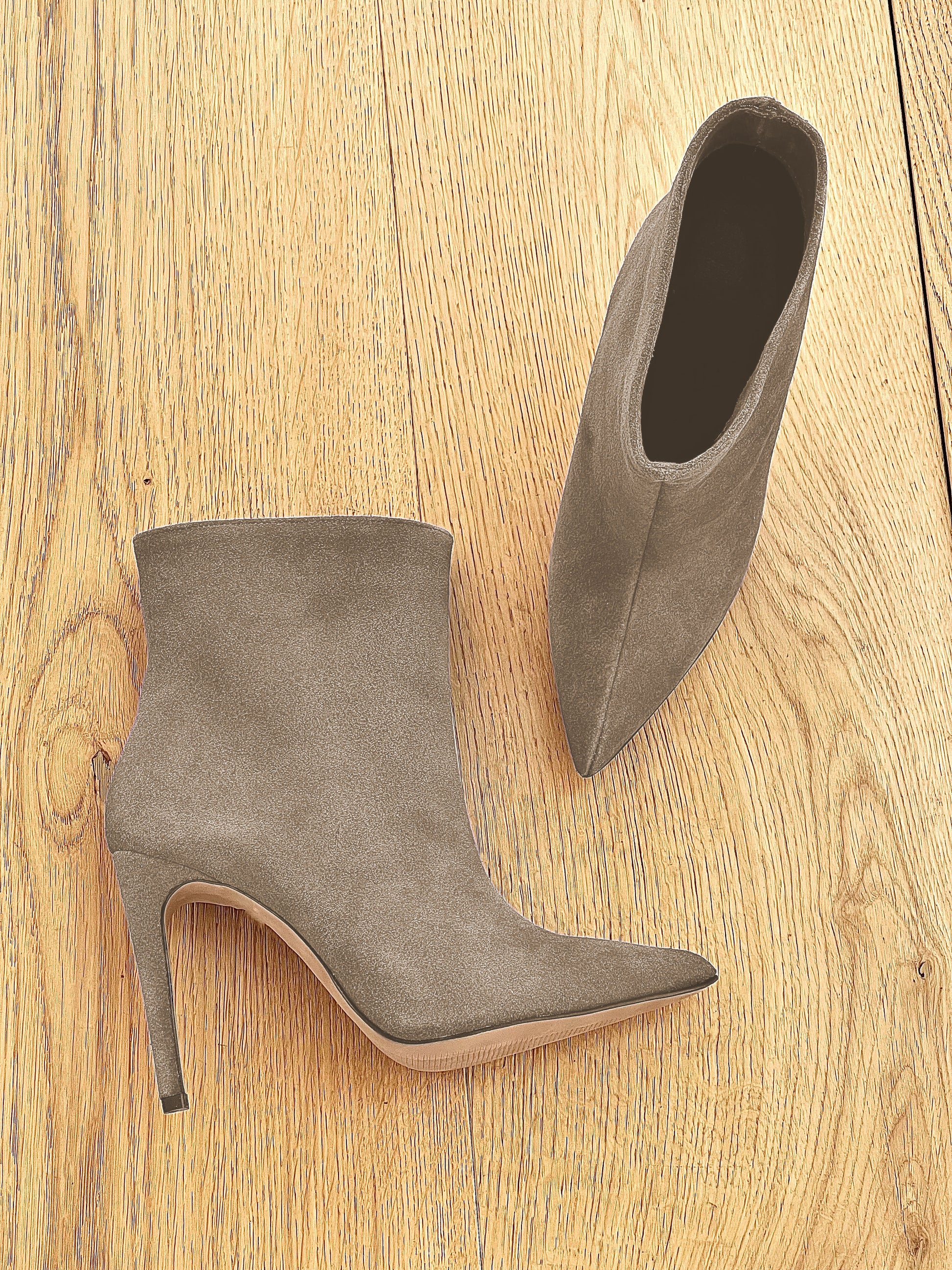 Hoge suède enkellaarsjes met puntige teen en naaldhak.