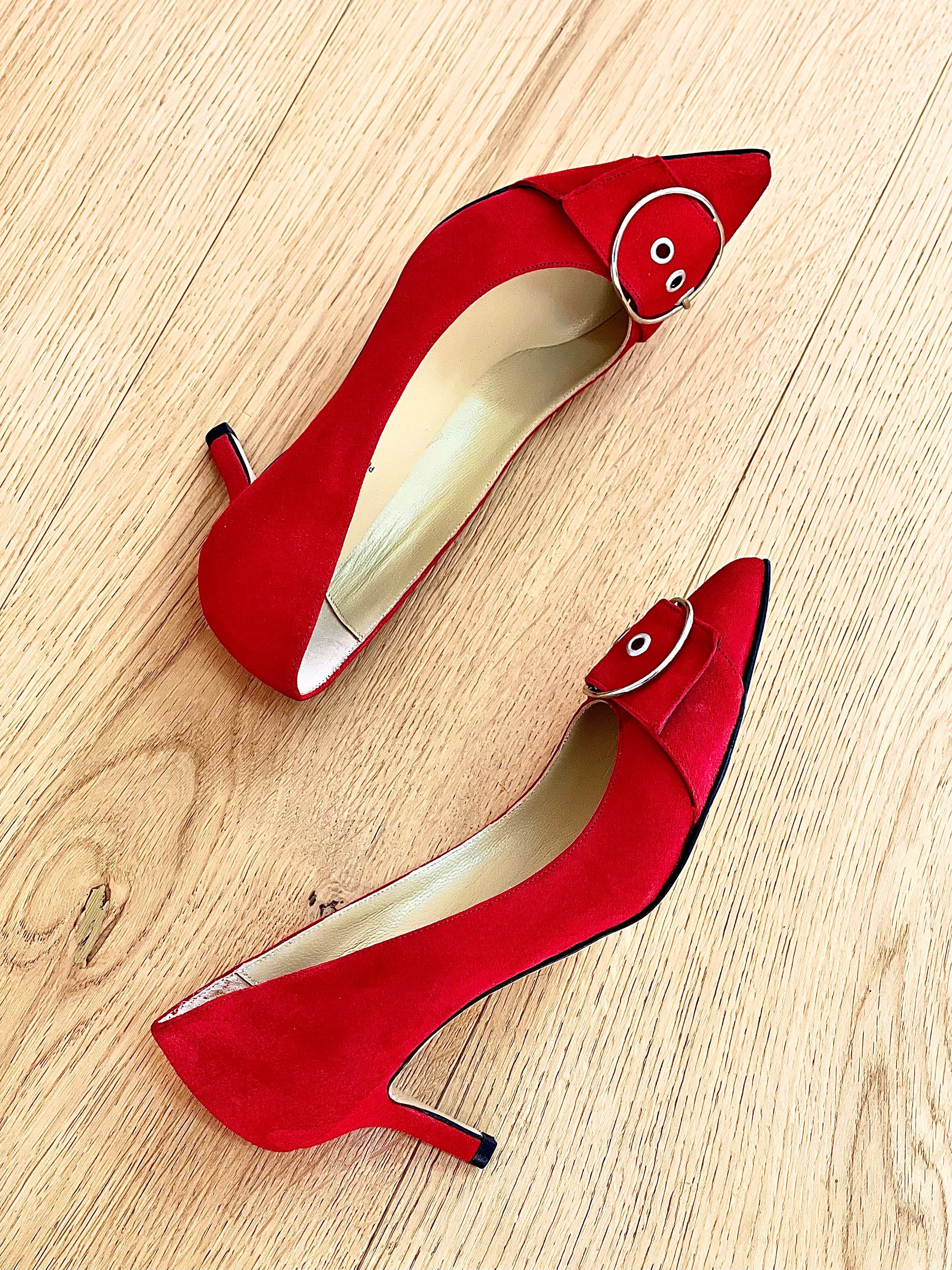 Pump met platte teen en grote ovale gesp op de halslijn.