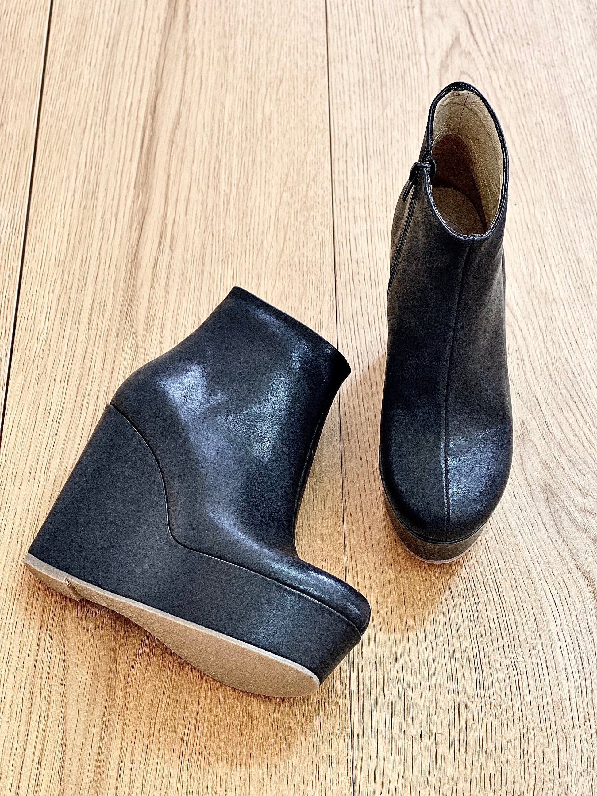 Hoge enkellaarsjes op leren sleehak.