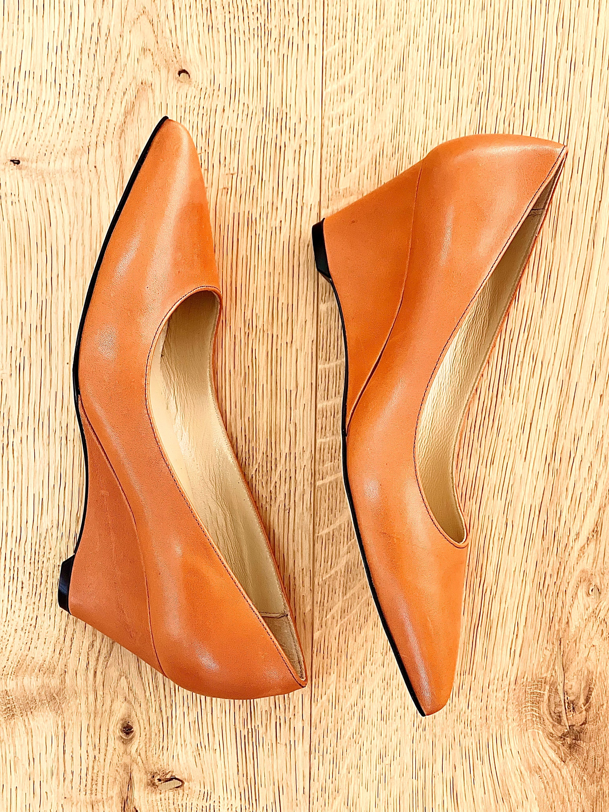 Spitse pump van leer met een sleehak van 6 cm aan de achterkant.