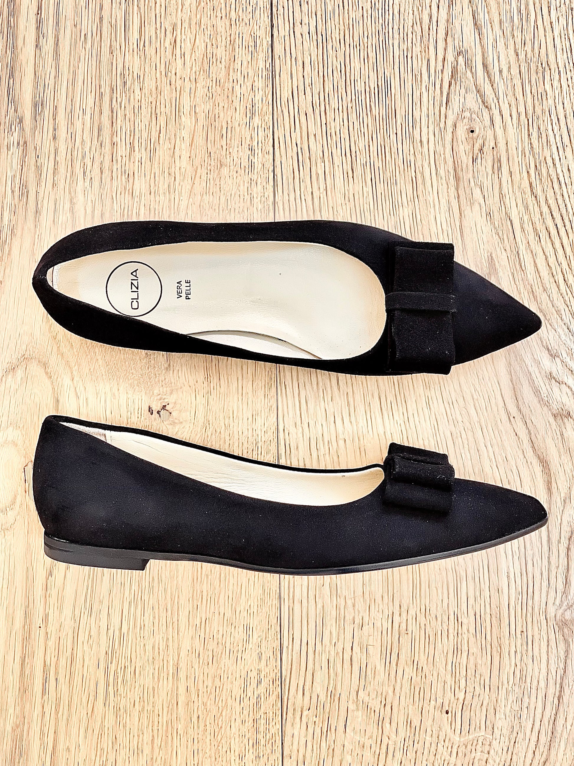 Puntige suède balletschoenen met strik.