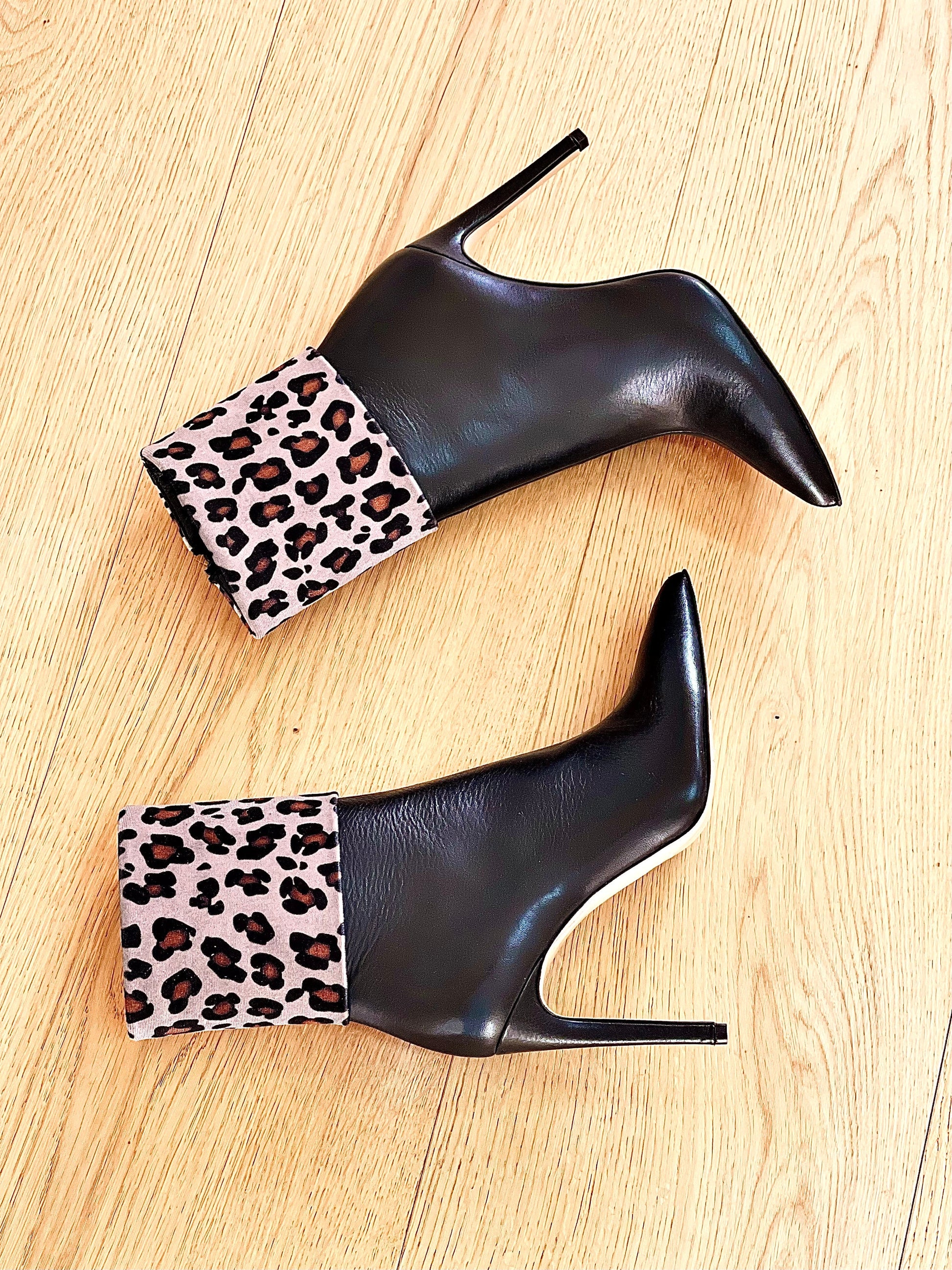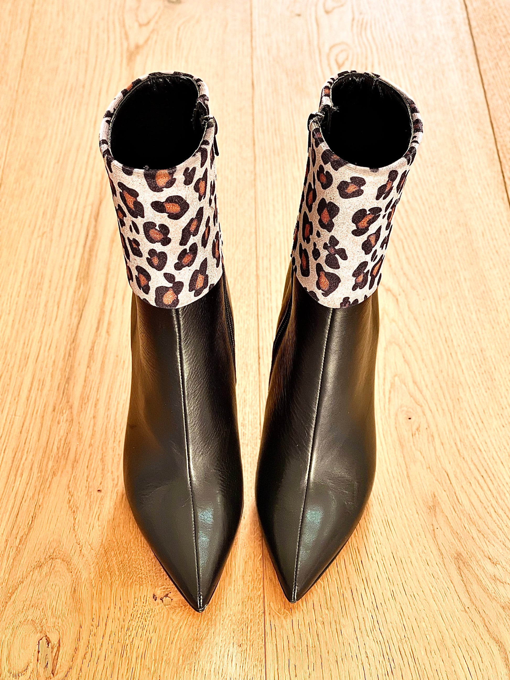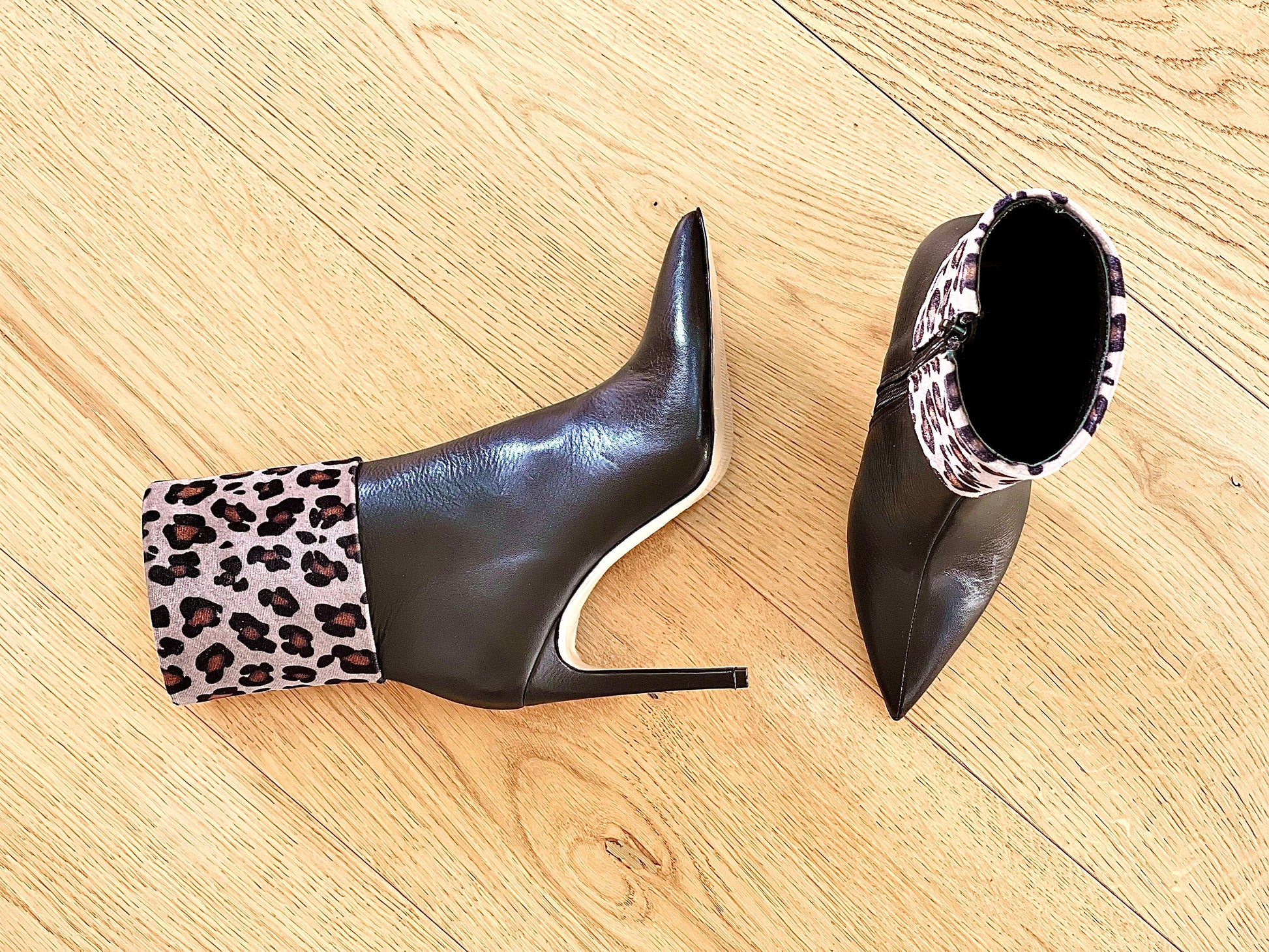 Hoge spitse enkellaarsjes van leer met een animalierijke naaldhak.