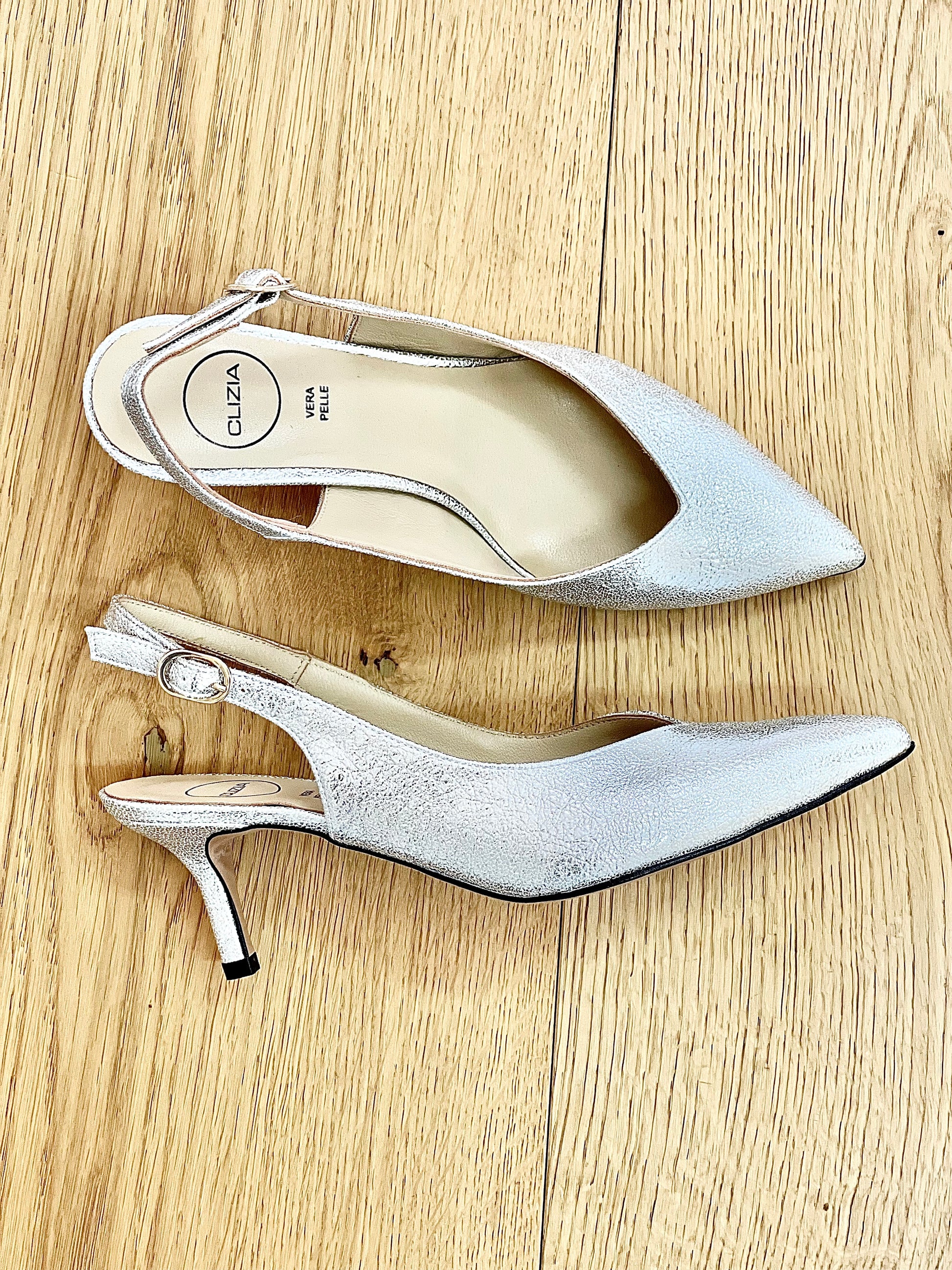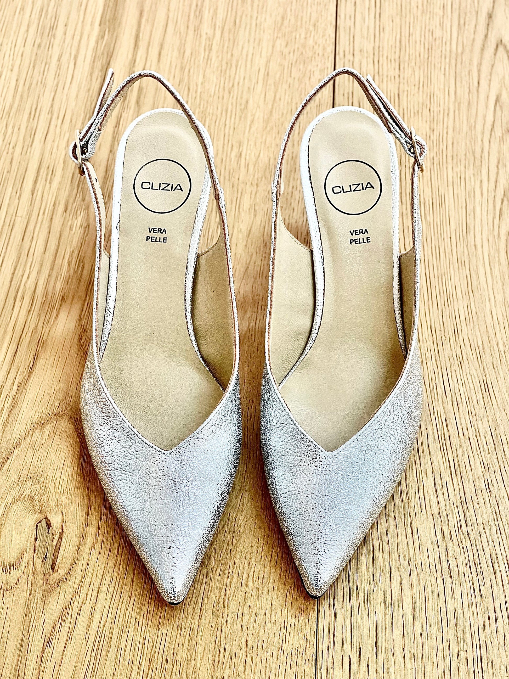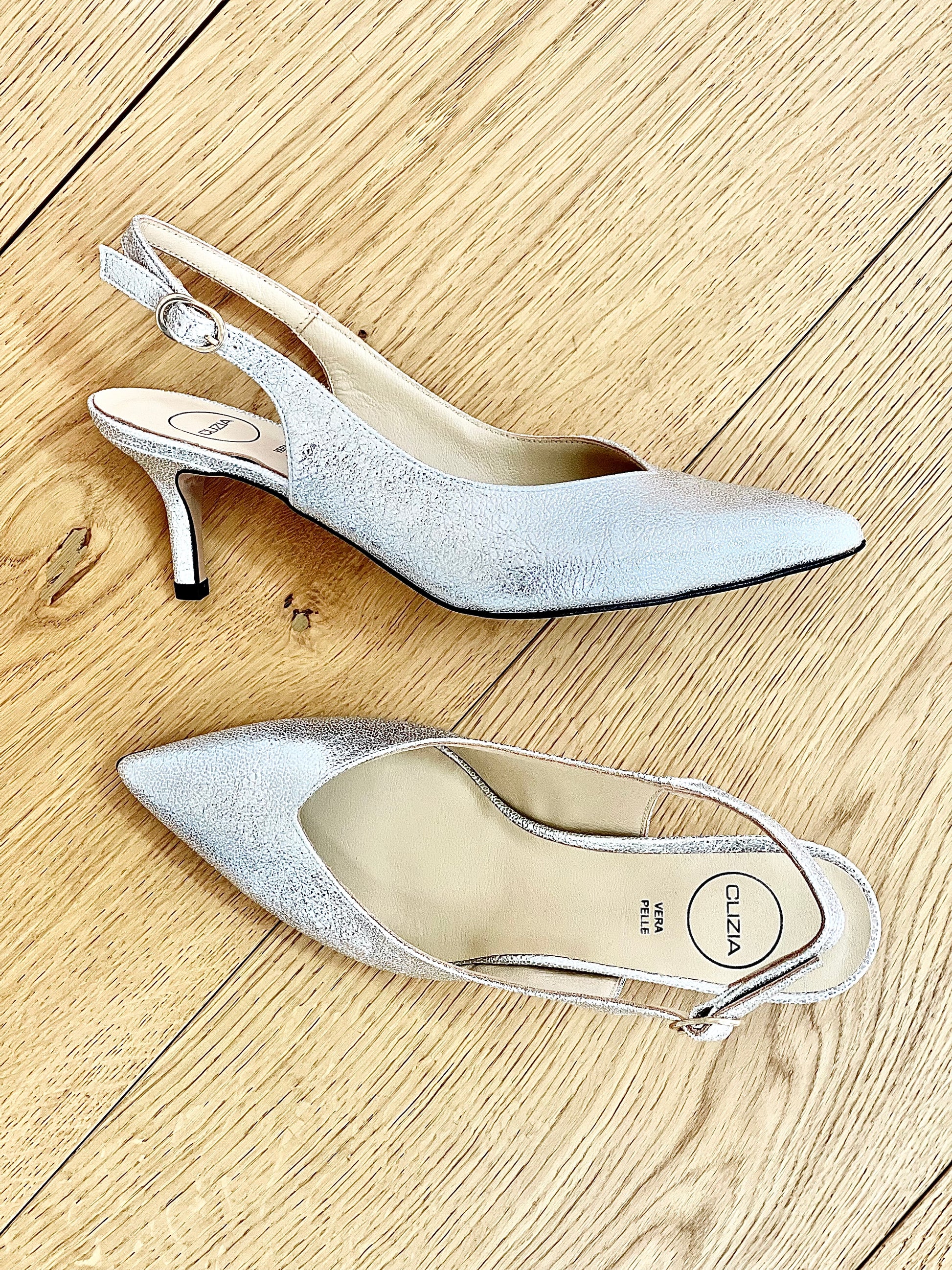 Spitse slingbackpump met V-hals en hak van 6 cm.