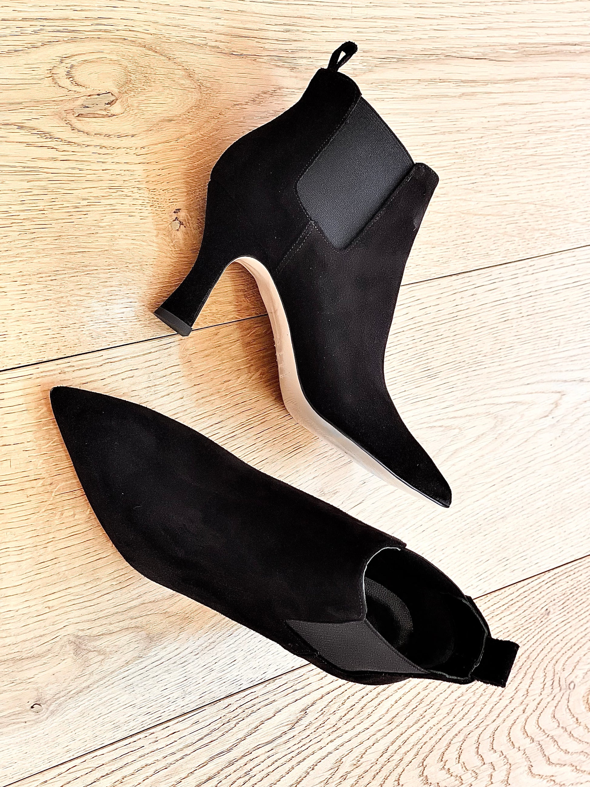 Chelsea enkellaarsjes spitse teen suède spoelhak 8cm.