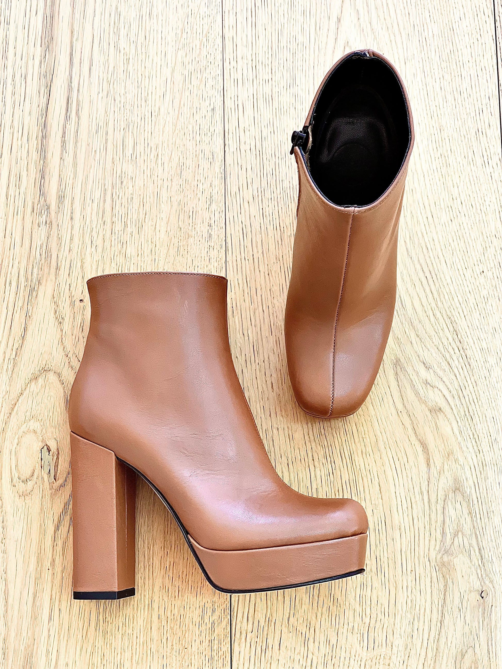 Leren enkellaarsjes met semi-vierkante teen, hak van 12 cm en plateau van 3 cm.