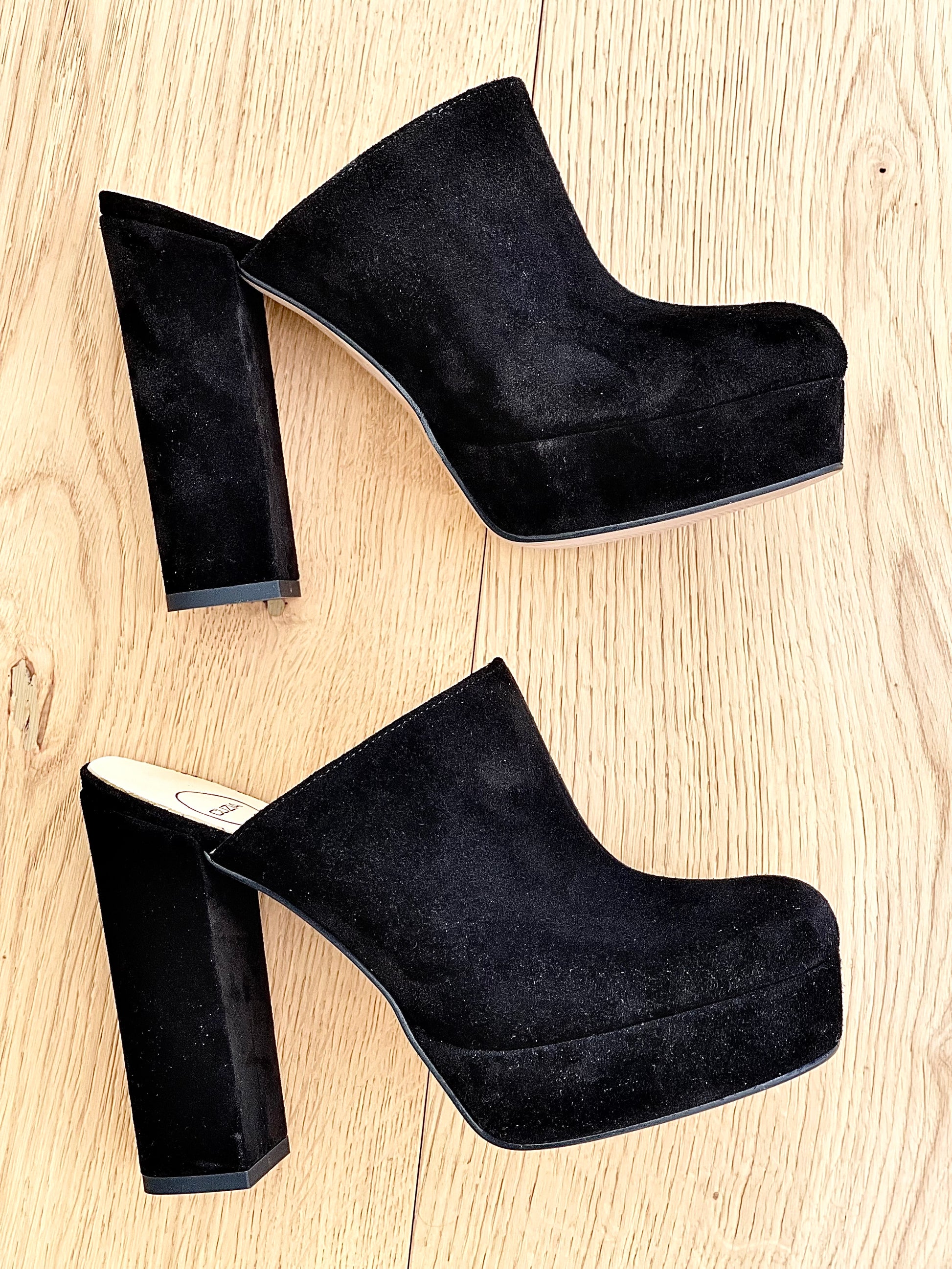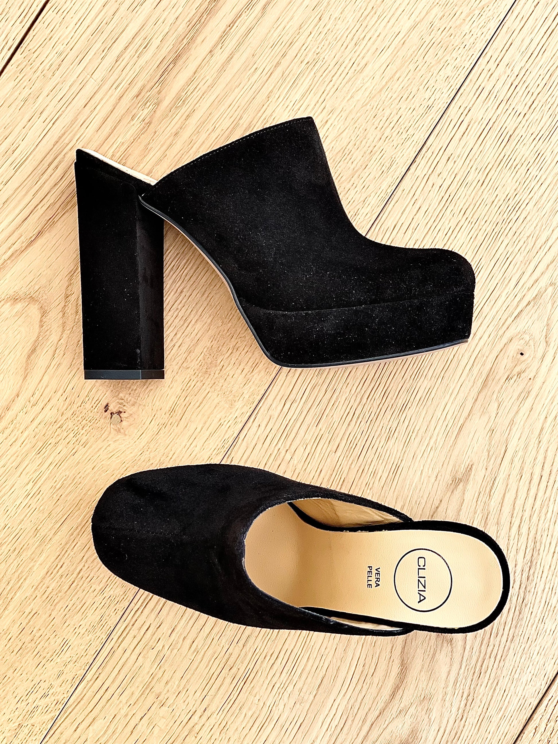 Semi-vierkante teen suède sabel met 12 cm hak en 3 cm plateau.