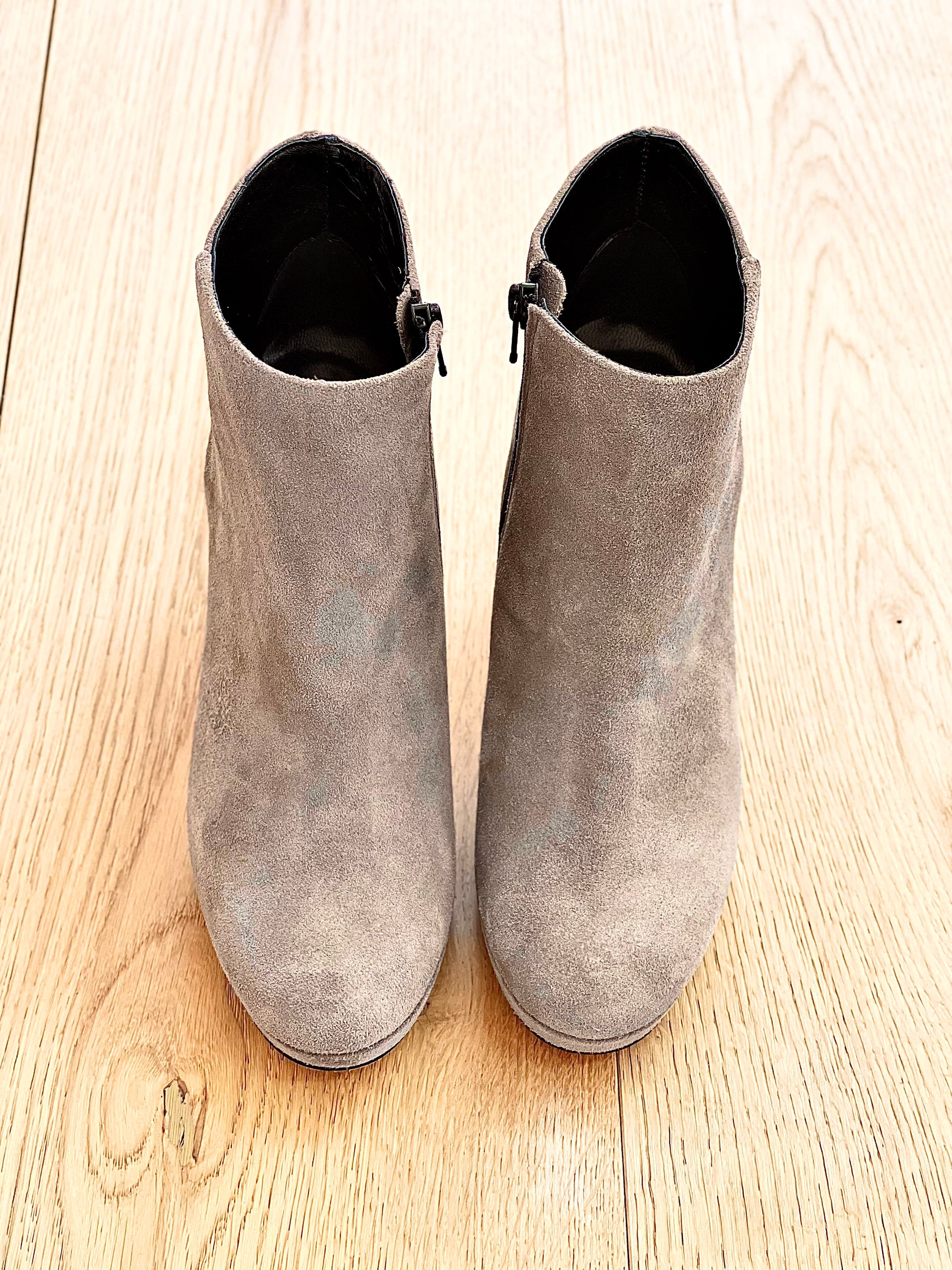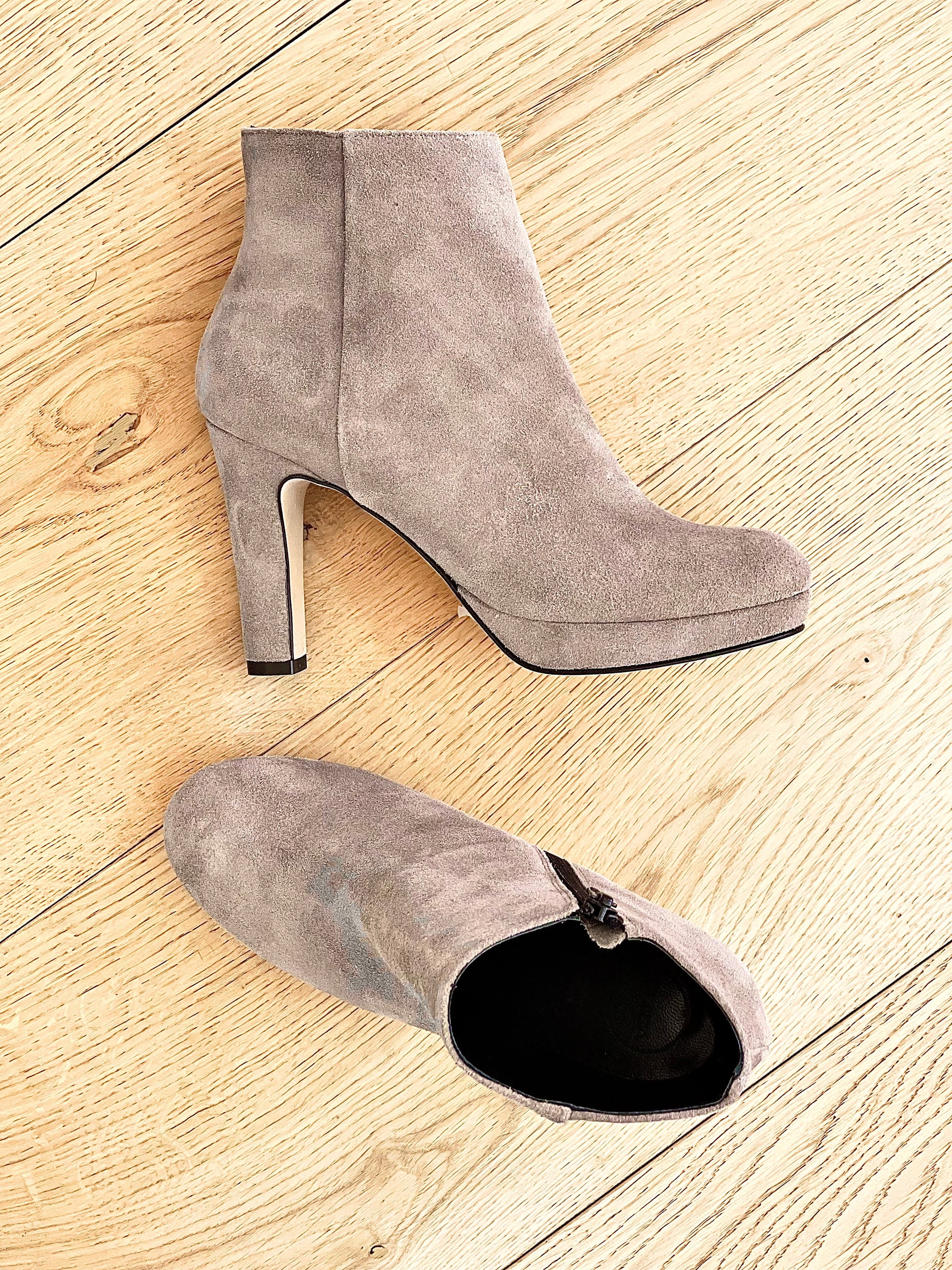 Suède enkellaarsjes met ronde neus, hak van 9 cm en plateau van 1 cm.