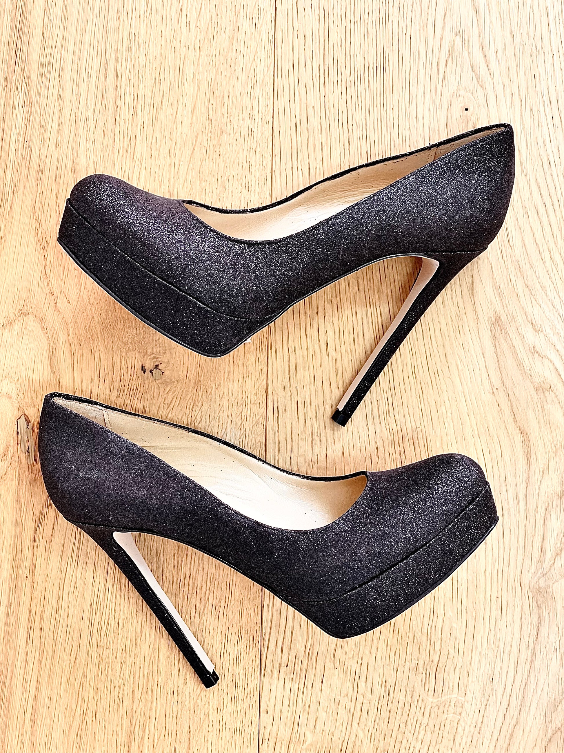 Elegante hoge pumps met ronde teen in glitter met een hak van 12 cm en een plateau van 2 cm.
