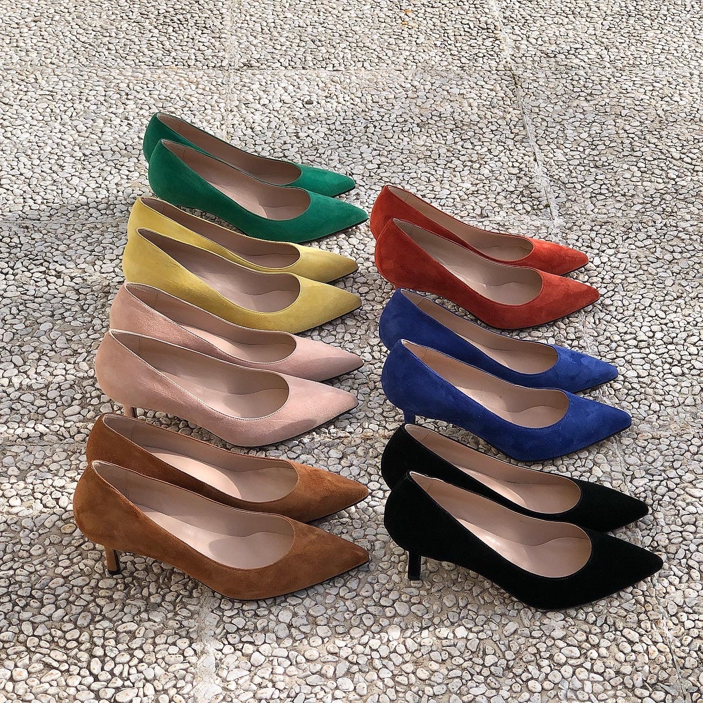 Suède pump met platte teen en hak van 6 cm.