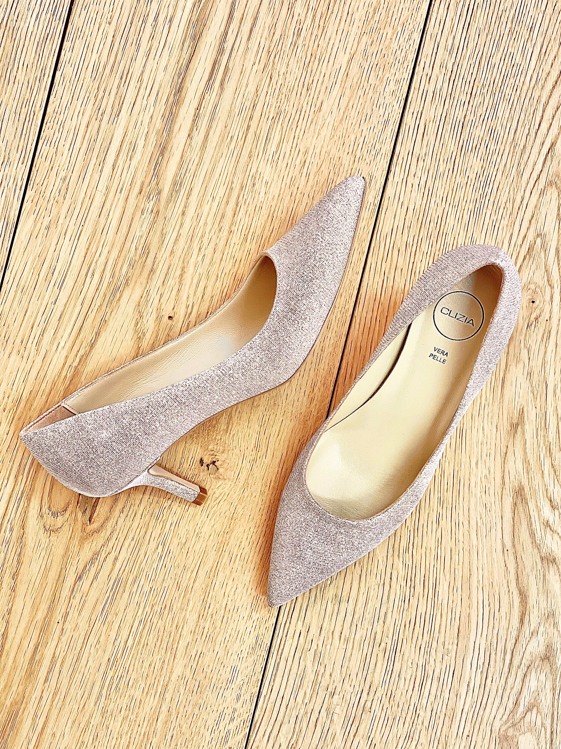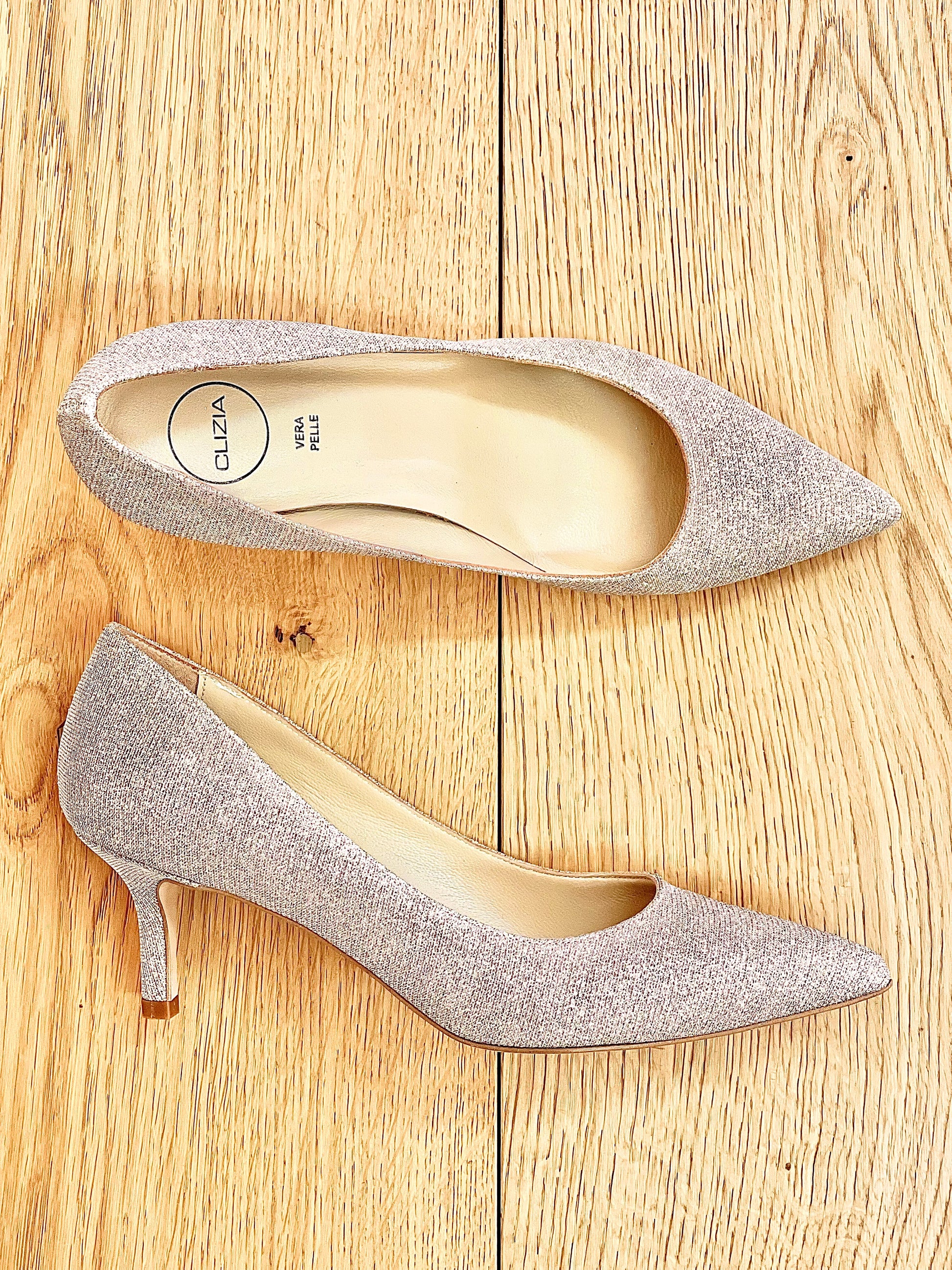 Pump met spitse teen en smalle glitterhak van 6 cm.