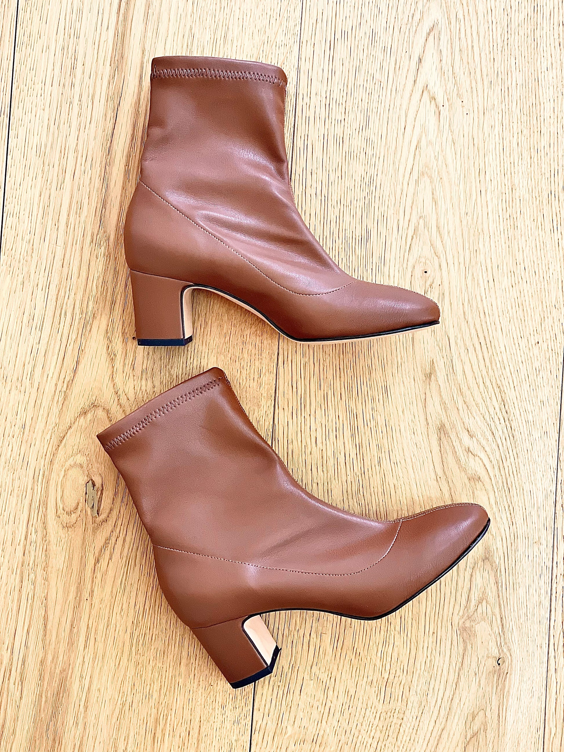 Enkellaarsjes met elastiek, ronde neus en brede hak.