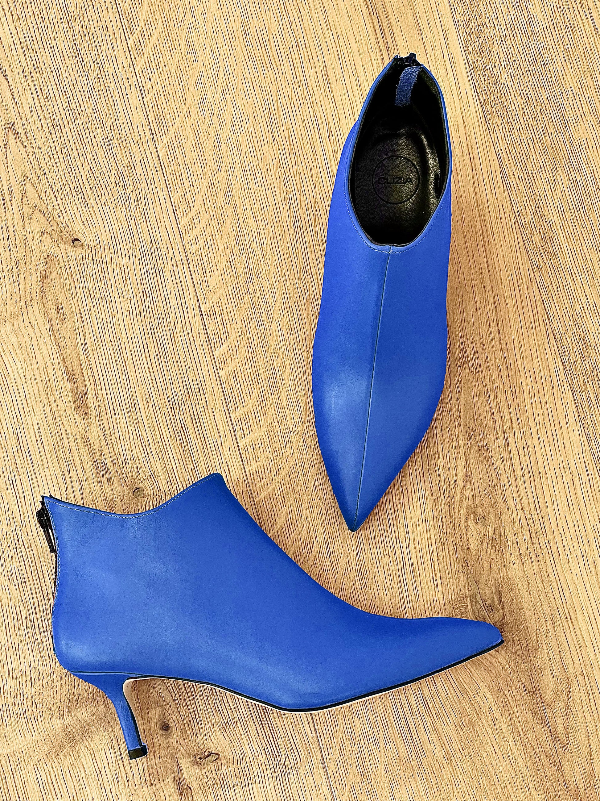 Leren enkellaarsjes met spitse neus, ritssluiting aan de achterkant en hak van 6 cm.