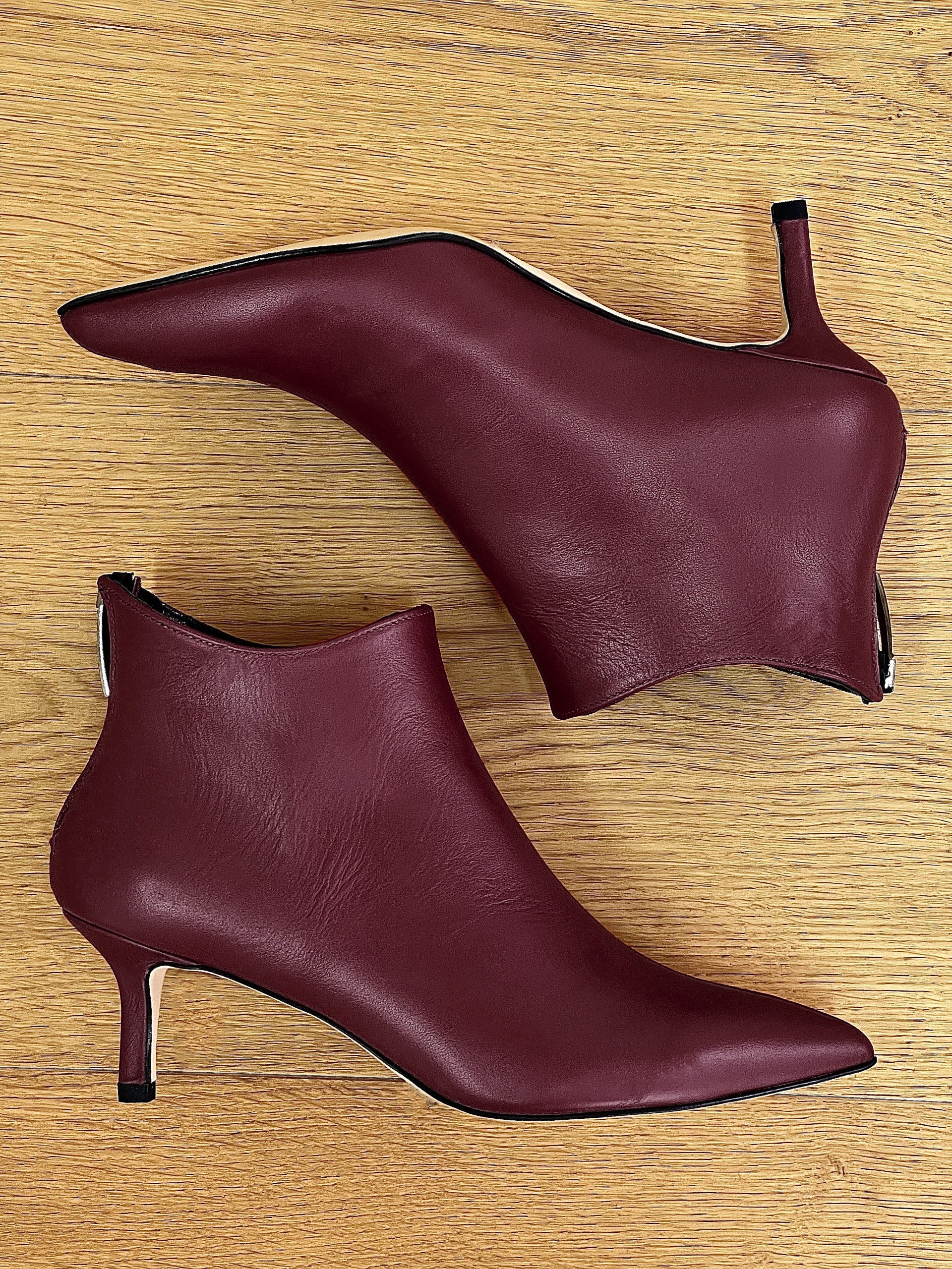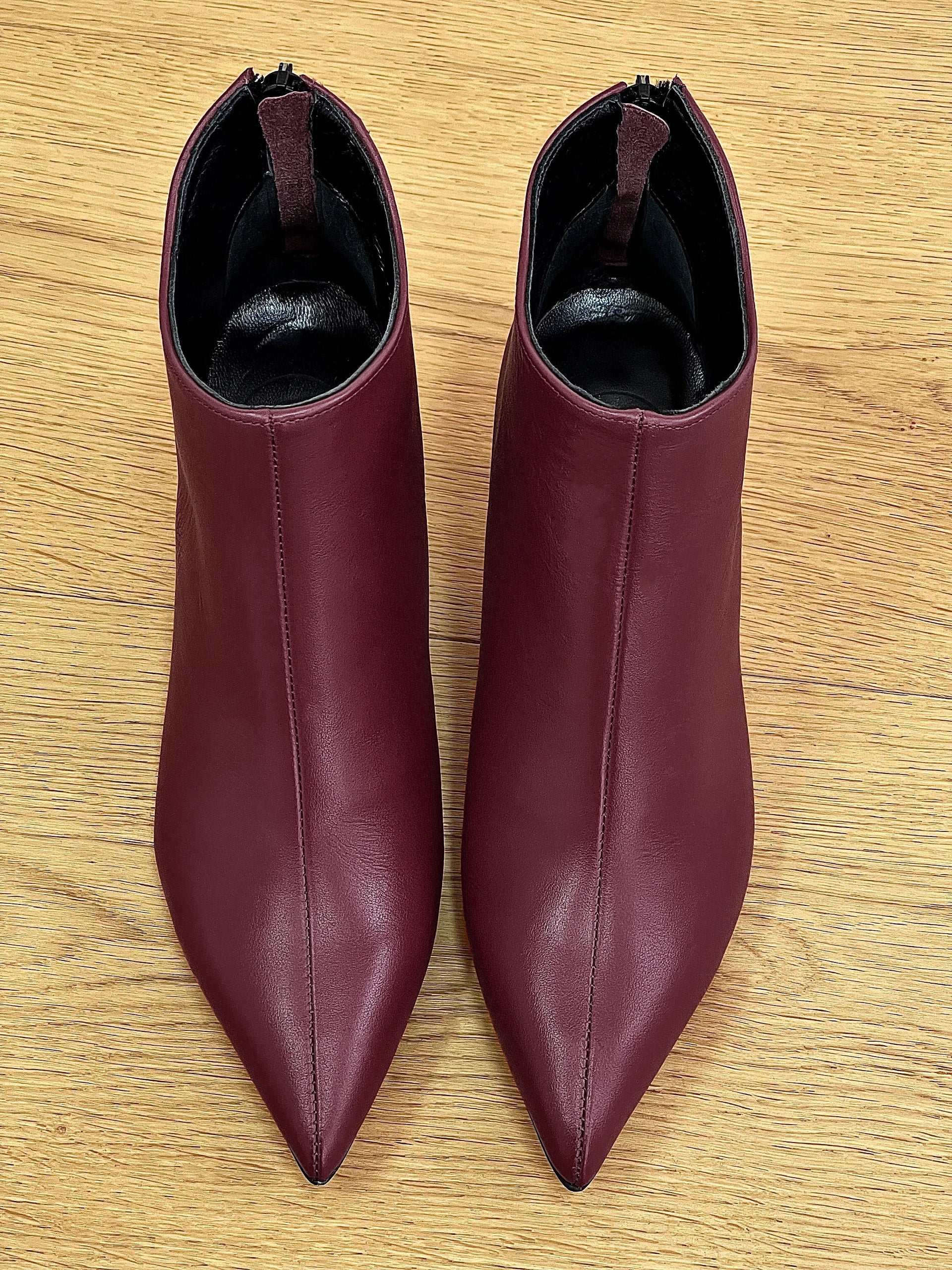 Leren enkellaarsjes met spitse neus, ritssluiting aan de achterkant en hak van 6 cm.