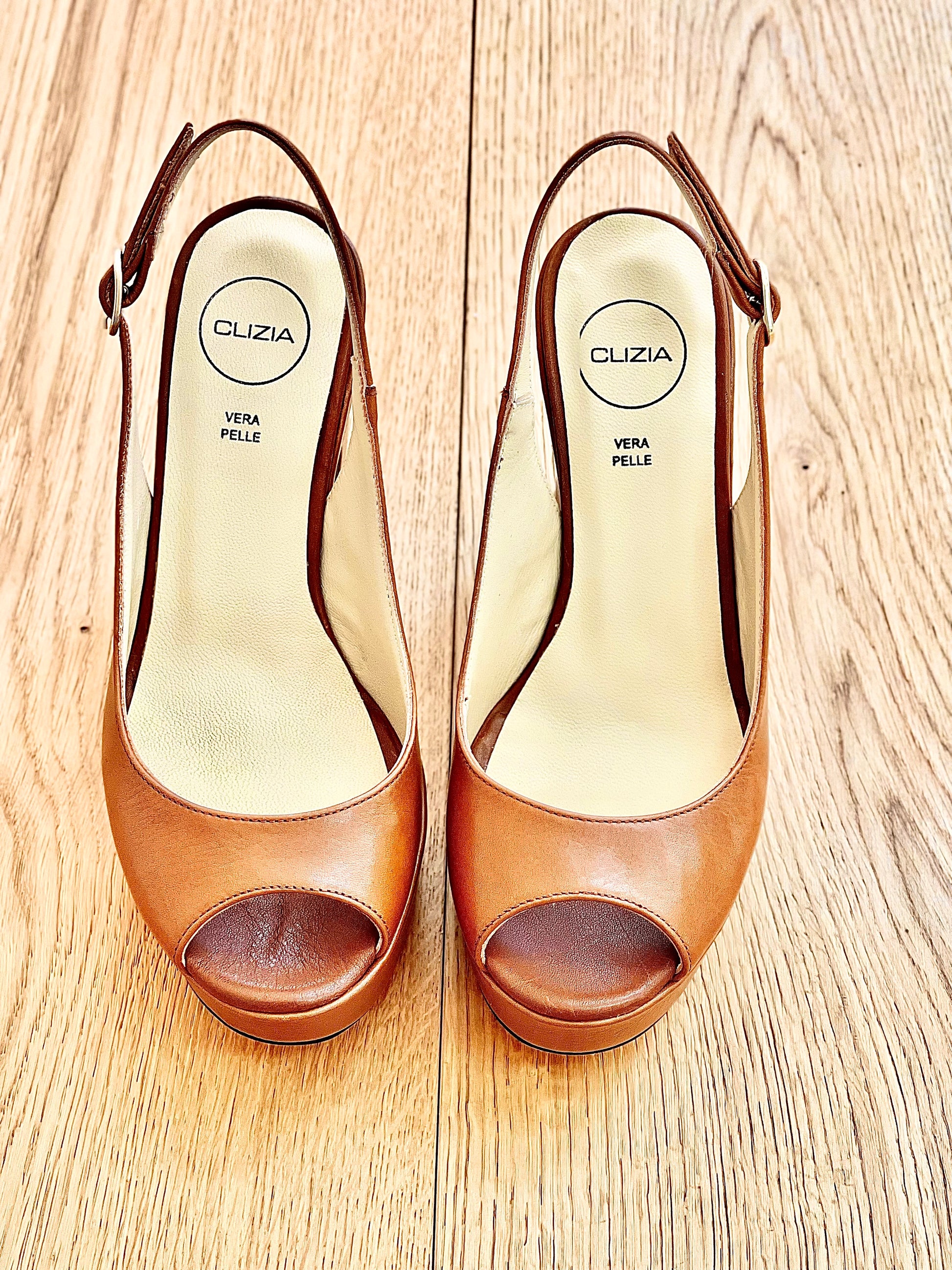 Leren peep toe slingback op 11,5 cm hoge sleehak en 4 cm plateau.