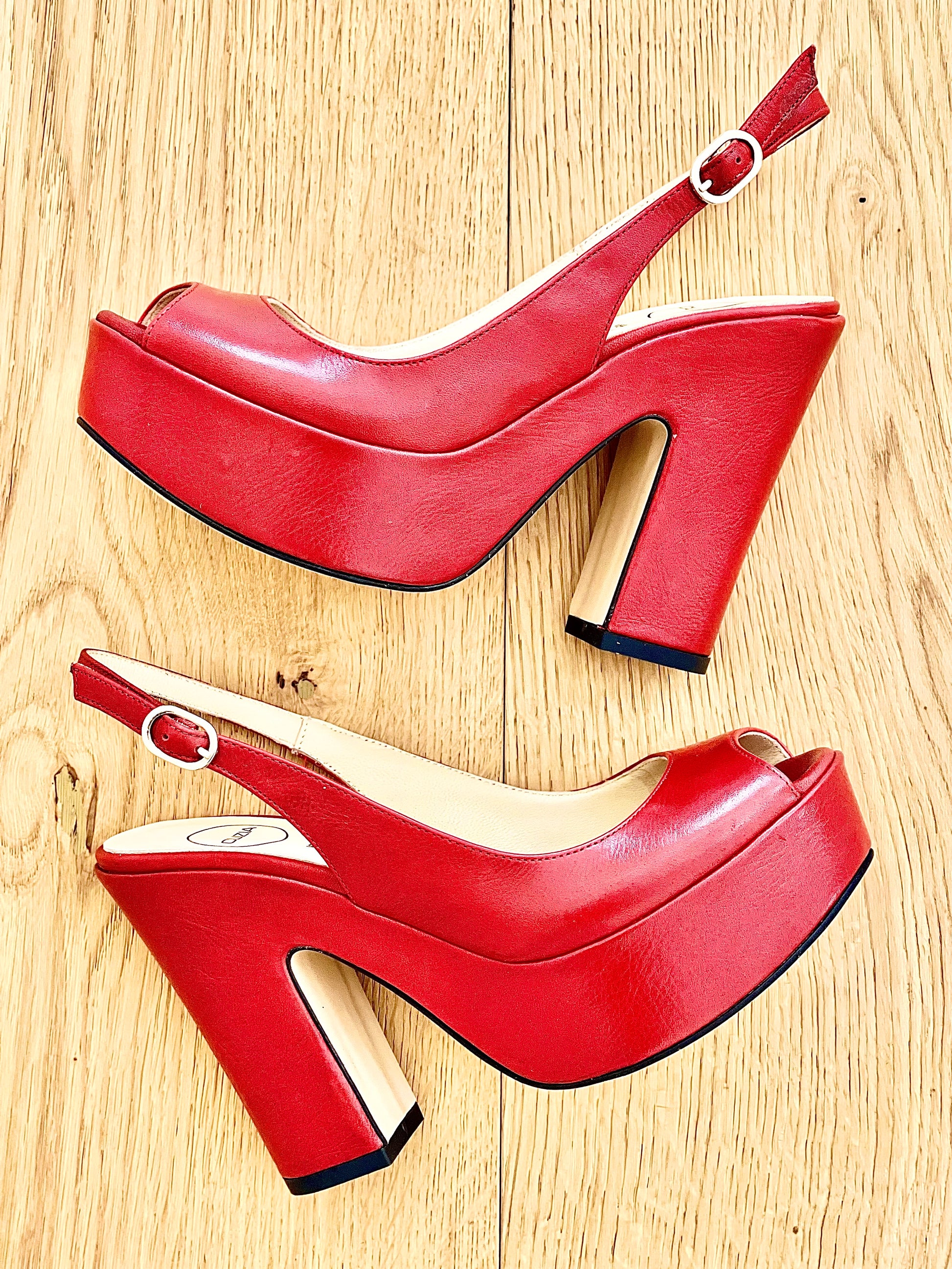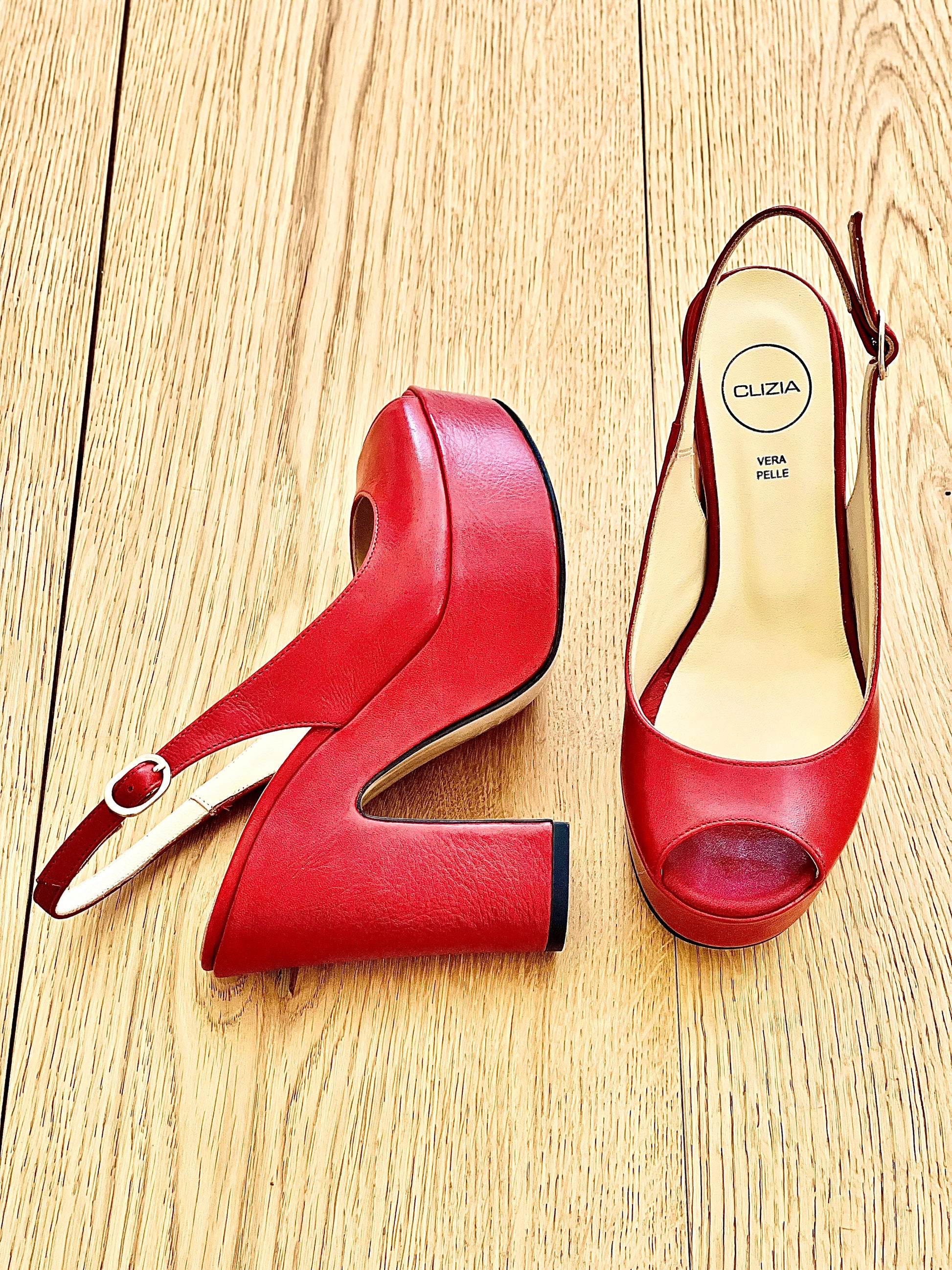 Leren peep toe slingback op 11,5 cm hoge sleehak en 4 cm plateau.